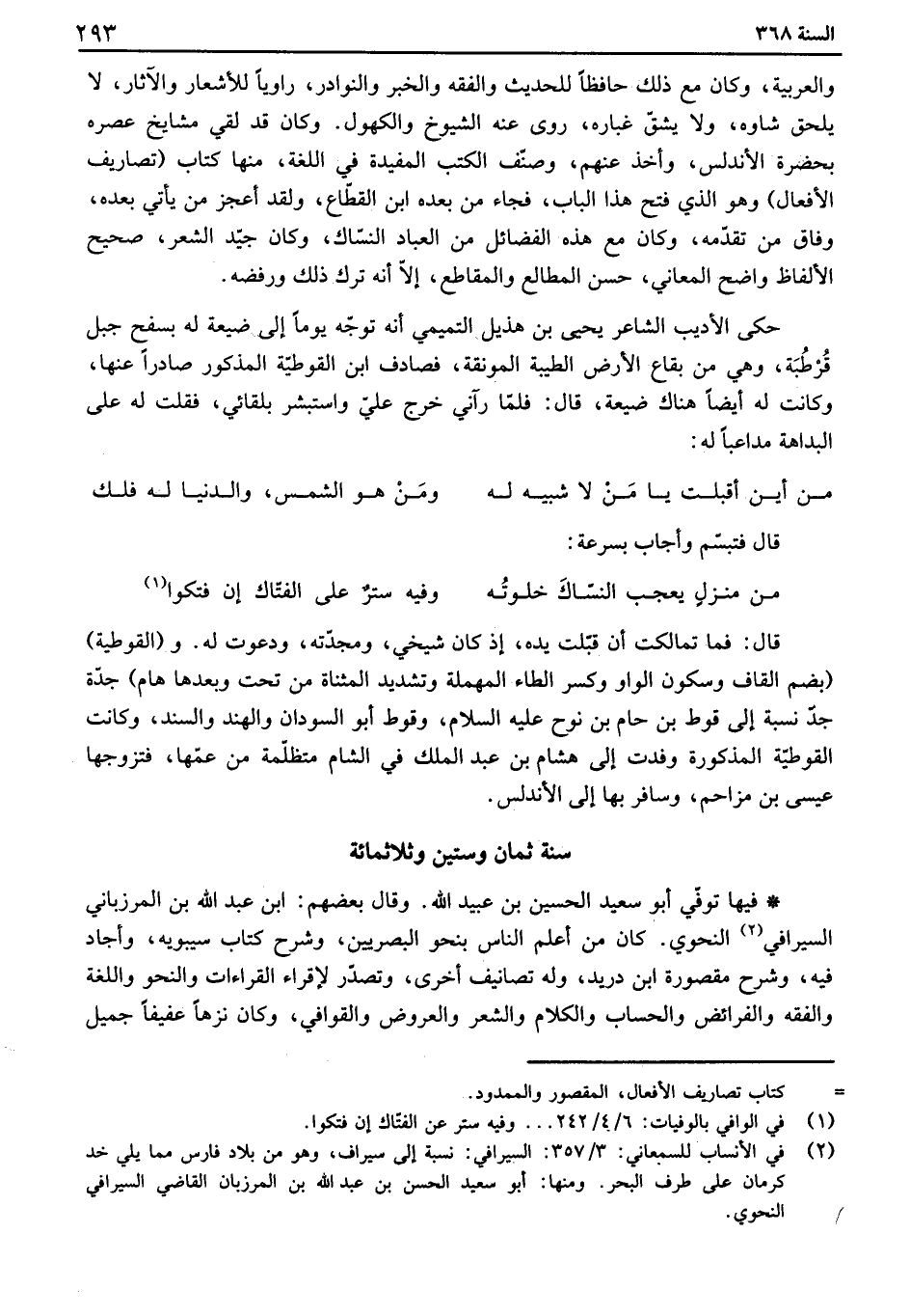 فيها توفي أبو سعيد الحسين بن عبيد الله. وقال بعضهم: ابن عبد الله بن المرزباني السيرافي النحوي. كان من أعلم الناس بنحو البصريين، وشرح كتاب سيبويه، وأجاد فيه، وشرح مقصورة ابن دريد، وله تصانيف أخرى، وتصدر لإقراء القراءات والنحو واللغة والفقه والفرائض والحساب والكلام والشعر والعروض والقوافي، وكان نزهاً عفيفاً جميل