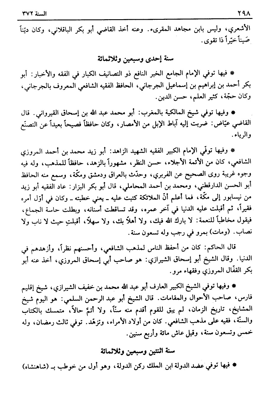 وفيها توفي الشيخ الكبير العارف أبو عبد الله محمد بن خفيف الشيرازي، شيخ إقليم فارس، صاحب الأحوال والمقامات. قال الشيخ أبو عبد الرحمن السلمي: هو اليوم شيخ المشايخ، تاريخ الزمان، لم يبق للقوم أقدم منه سناً، ولا أتم حالاً، متمسك بالكتاب والسنة، فقيه على مذهب الشافعي. كان من أولاد الأمراء، وتزهد. توفي ثالث رمضان، وله خمس وتسعون سنة، وقيل عاش مائة وأربع سنين.