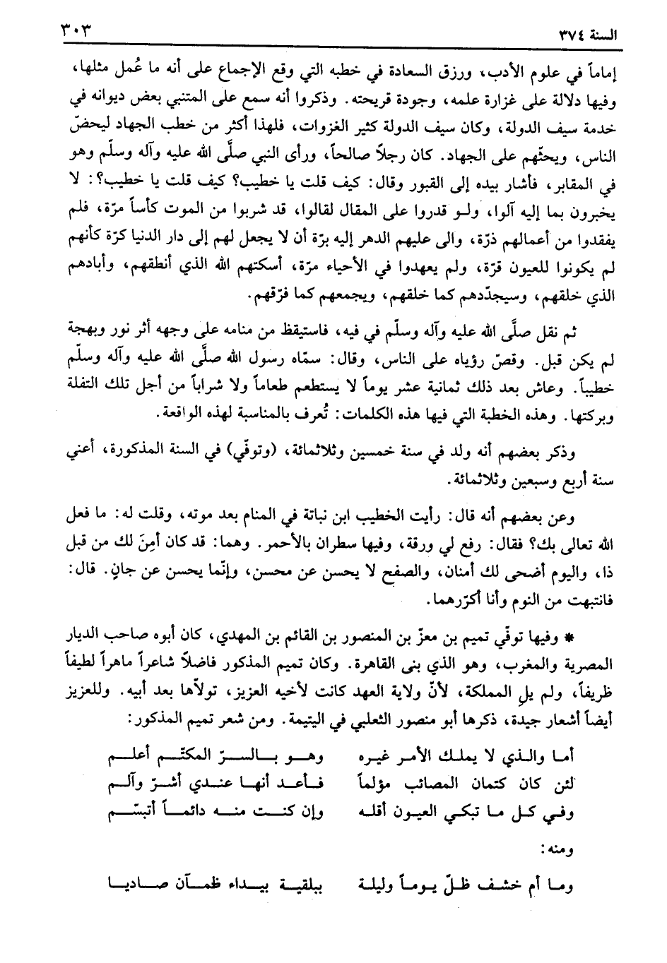 وفيها توفي تميم بن معز بن المنصور بن القائم بن المهدي، كان أبوه صاحب الديار المصرية والمغرب، وهو الذي بنى القاهرة. وكان تميم المذكور فاضلاً شاعراً ماهراً لطيفاً ظريفاً، ولم يل المملكة، لأن ولاية العهد كانت لأخيه العزيز، تولاها بعد أبيه. وللعزيز أيضاً أشعار جيدة، ذكرها أبو منصور الثعلبي في اليتيمة. ومن شعر تميم المذكور: