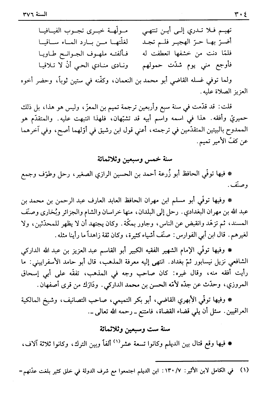 وفيها توفي الأبهري القاضي، أبو بكر التميمي، صاحب التصانيف، وشيخ المالكية العراقيين. سئل أن يلي قضاء القضاة، فامتنع رحمه الله تعالى.