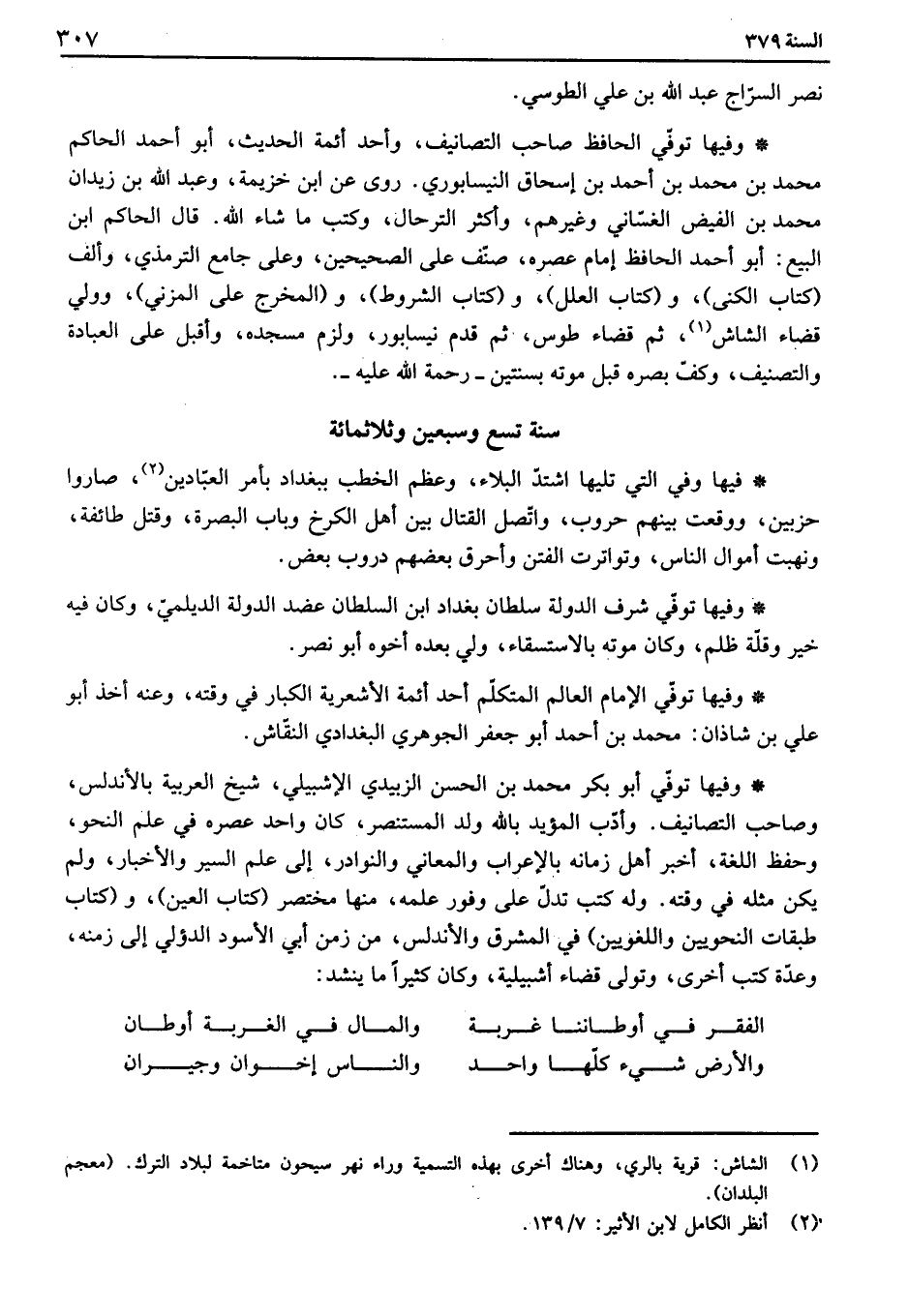وفيها توفي الحافظ صاحب التصانيف، وأحد أئمة الحديث، أبو أحمد الحاكم محمد بن محمد بن أحمد بن إسحاق النيسابوري. روى عن ابن خزيمة، وعبد الله بن زيدان محمد بن الفيض الغساني وغيرهم، وأكثر الترحال، وكتب ما شاء الله. قال الحاكم ابن البيع: أبو أحمد الحافظ إمام عصره، صنف على الصحيحين، وعلى جامع الترمذي، وألف " كتاب الكنى "، و " كتاب العلل "، و " كتاب الشروط "، و " المخرج على المزني "، وولي قضاء الشاش، ثم قضاء طوس، ثم قدم نيسابور، ولزم مسجده، وأقبل على العبادة والتصنيف، وكف بصره قبل موته بسنتين رحمة الله عليه.