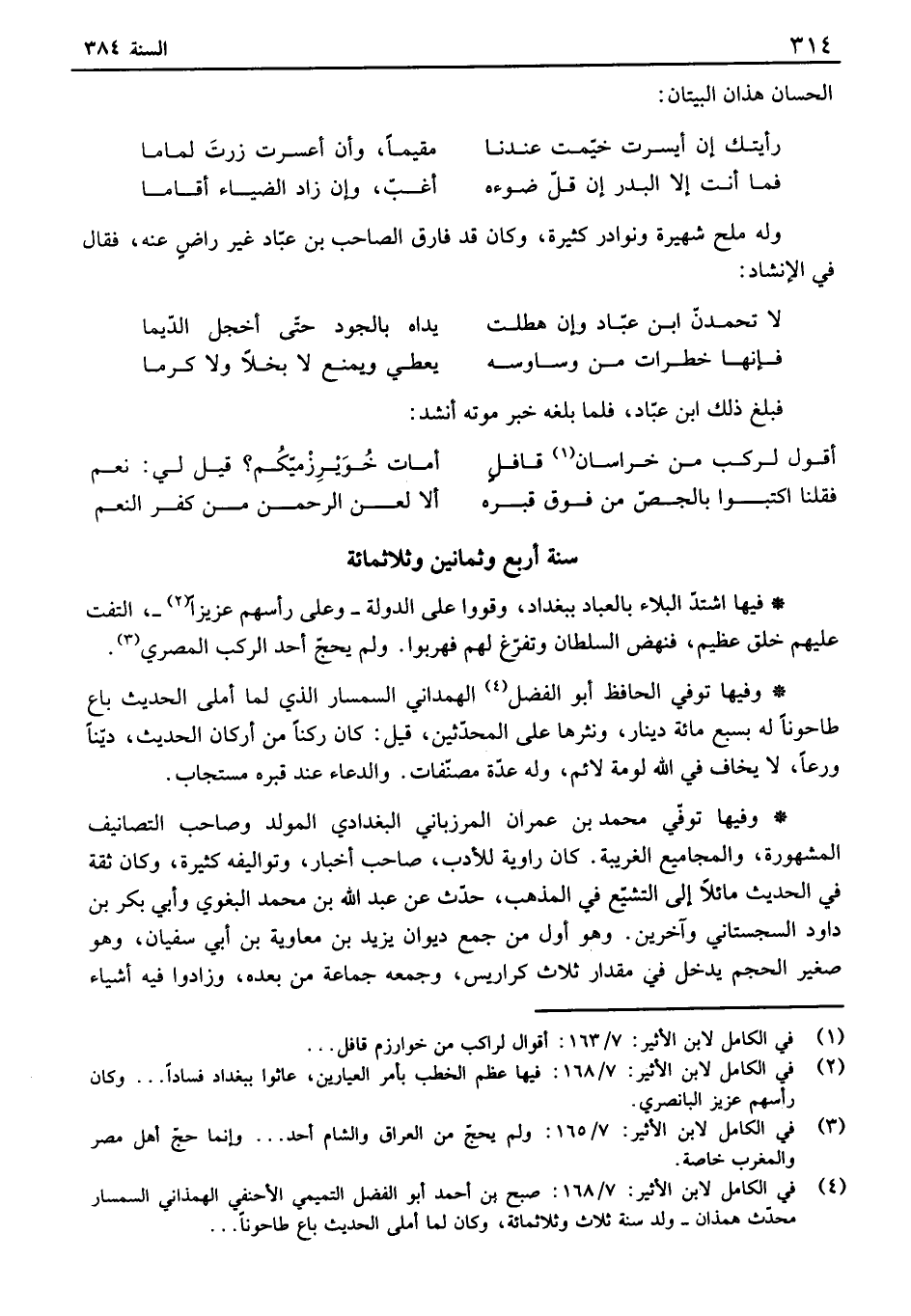 وفيها توفي محمد بن عمران المرزباني البغدادي المولد وصاحب التصانيف المشهورة، والمجاميع الغريبة. كان راوية للأدب، صاحب أخبار، وتواليفه كثيرة، وكان ثقة في الحديث مائلاً إلى التشيع في المذهب، حدث عن عبد الله بن محمد البغوي وأبي بكر بن داد السجستاني وآخرين. وهو أول من جمع ديوان يزيد بن معاوية بن أبي سفيان، وهو صغير الحجم يدخل في مقدار ثلاث كراديس، وجمعه جماعة من بعده، وزادوا فيه أشياء
