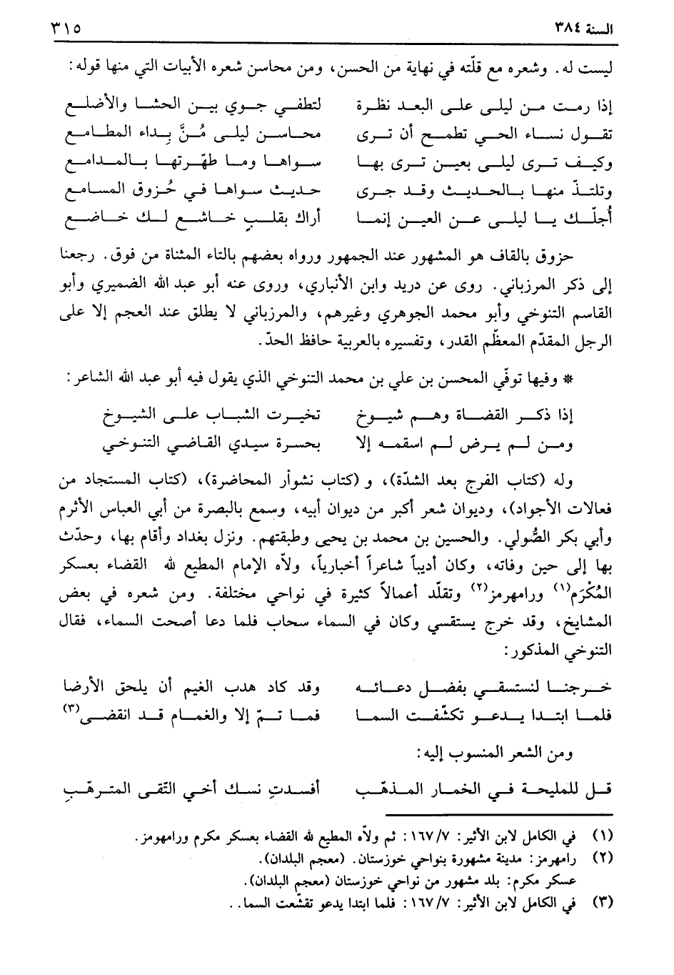 وفيها توفي المحسن بن علي بن محمد التنوخي الذي يقول فيه أبو عبد الله الشاعر: