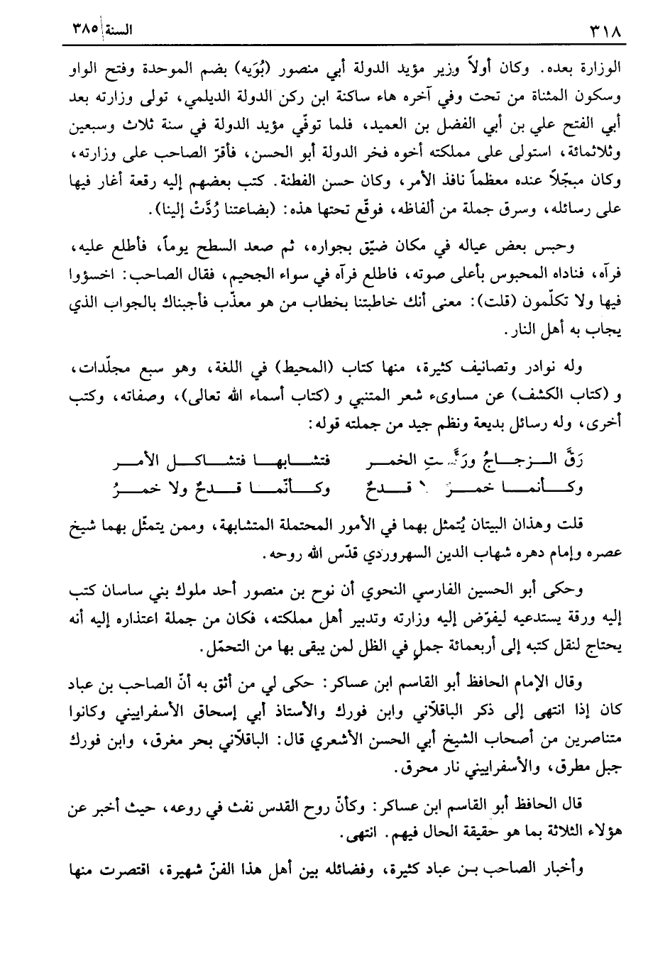وأخبار الصاحب بن عباد كثيرة، وفضائله بين أهل هذا الفن شهيرة، اقتصرت منها