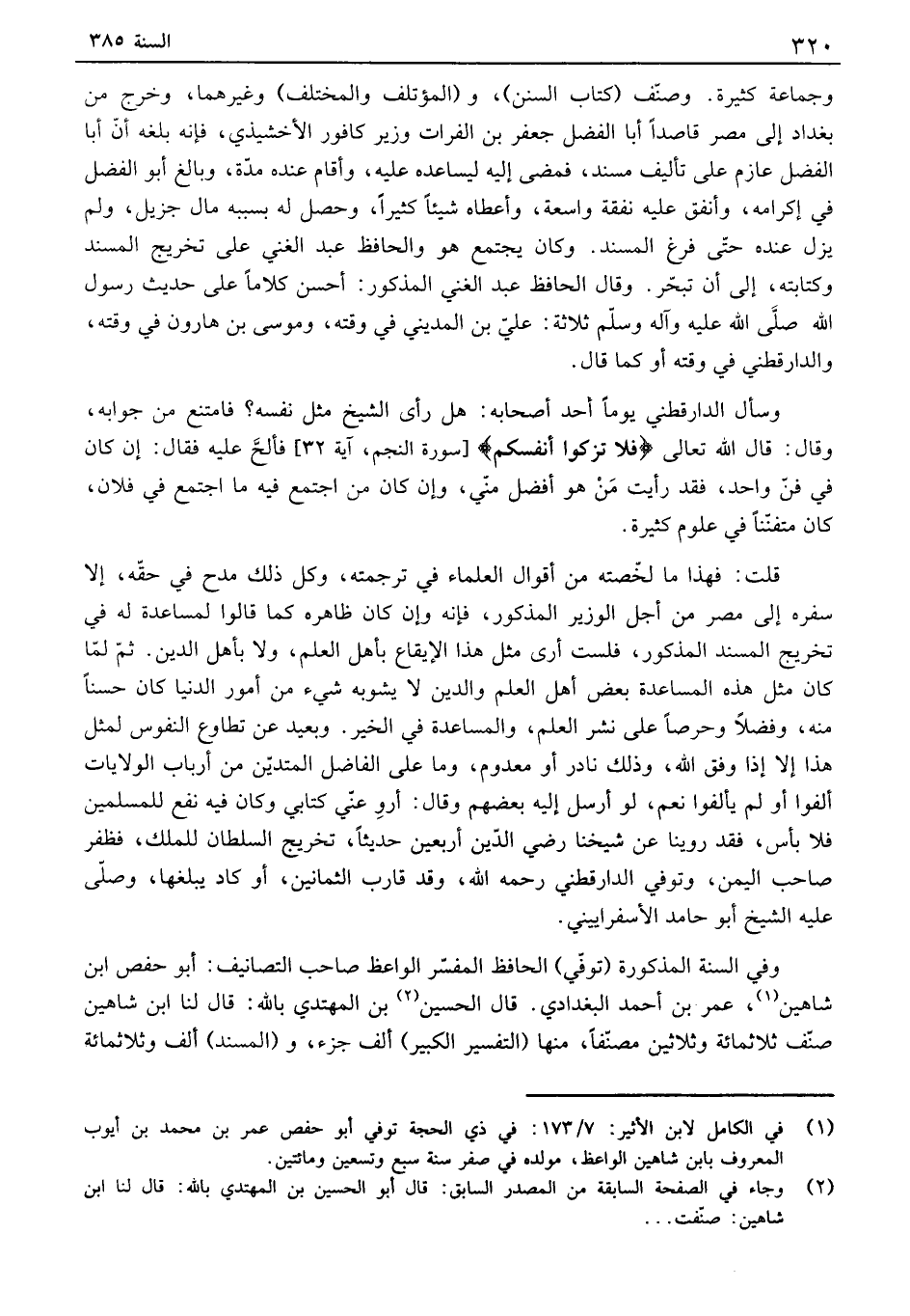 وفي السنة المذكورة " توفي " الحافظ المفسر الواعظ صاحب التصانيف: أبو حفص ابن شاهين عمر بن أحمد البغدادي. قال الحسين بن المهدي بالله: قال لنا ابن شاهين صنف ثلاثمائة وثلاثين مصنفاً، منها " التفسير الكبير " ألف جزء، و " المسند " ألف وثلاثمائة