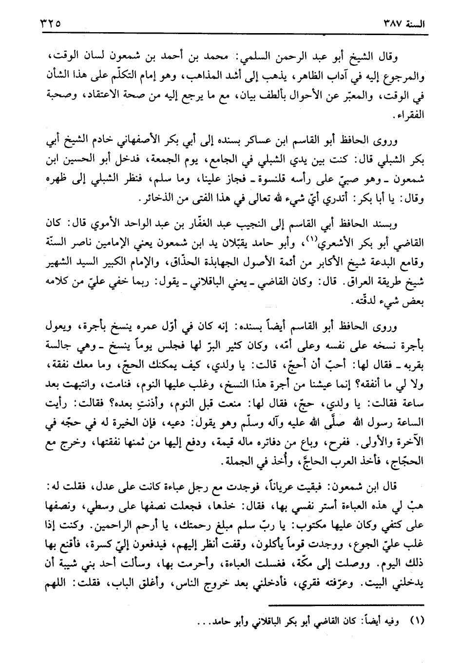 وبسند الحافظ أبي القاسم إلى النجيب عبد الغفار بن عبد الواحد الأموي قال: كان القاضي أبو بكر الأشعري، وأبو حامد يقبلان يد ابن شمعون يعني الإمامين ناصر السنة وقامع البدعة شيخ الأكابر من أئمة الأصول الجهابذة الحذاق، والإمام الكبير السيد الشهير شيخ طريقة العراق. قال: وكان القاضي - يعني الباقلاني - يقول: ربما خفي علي من كلامه بعض شيء لدقته.