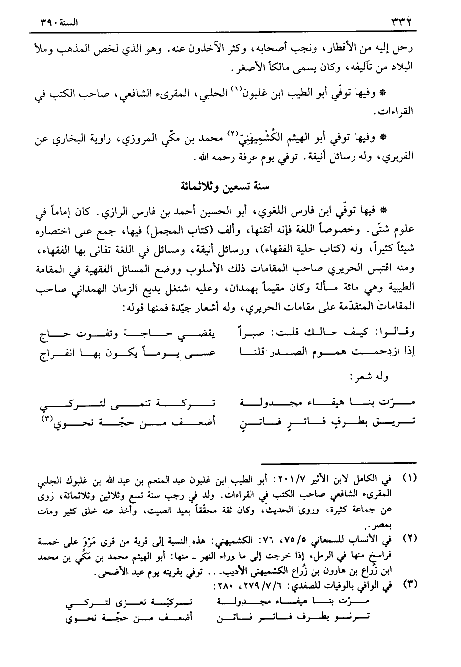 فيها توفي ابن فارس اللغوي، أبو الحسين أحمد بن فارس الرازي. كان إماماً في علوم شتى. وخصوصاً اللغة فإنه أتقنها، وألف " كتاب المجمل " فيها، جمع على اختصاره شيئاً كثيراً، وله " كتاب حلية الفقهاء "، ورسائل أنيقة، ومسائل في اللغة تفانى بها الفقهاء، ومنه اقتبس الحريري صاحب المقامات ذلك الأسلوب ووضع المسائل الفقهية في المقامة الطيبية وهي مائة مسألة وكان مقيماً بهمدان، وعليه اشتغل بديع الزمان الهمداني صاحب المقامات المتقدمة على مقامات الحريري، وله أشعار جيدة فمنها قوله: