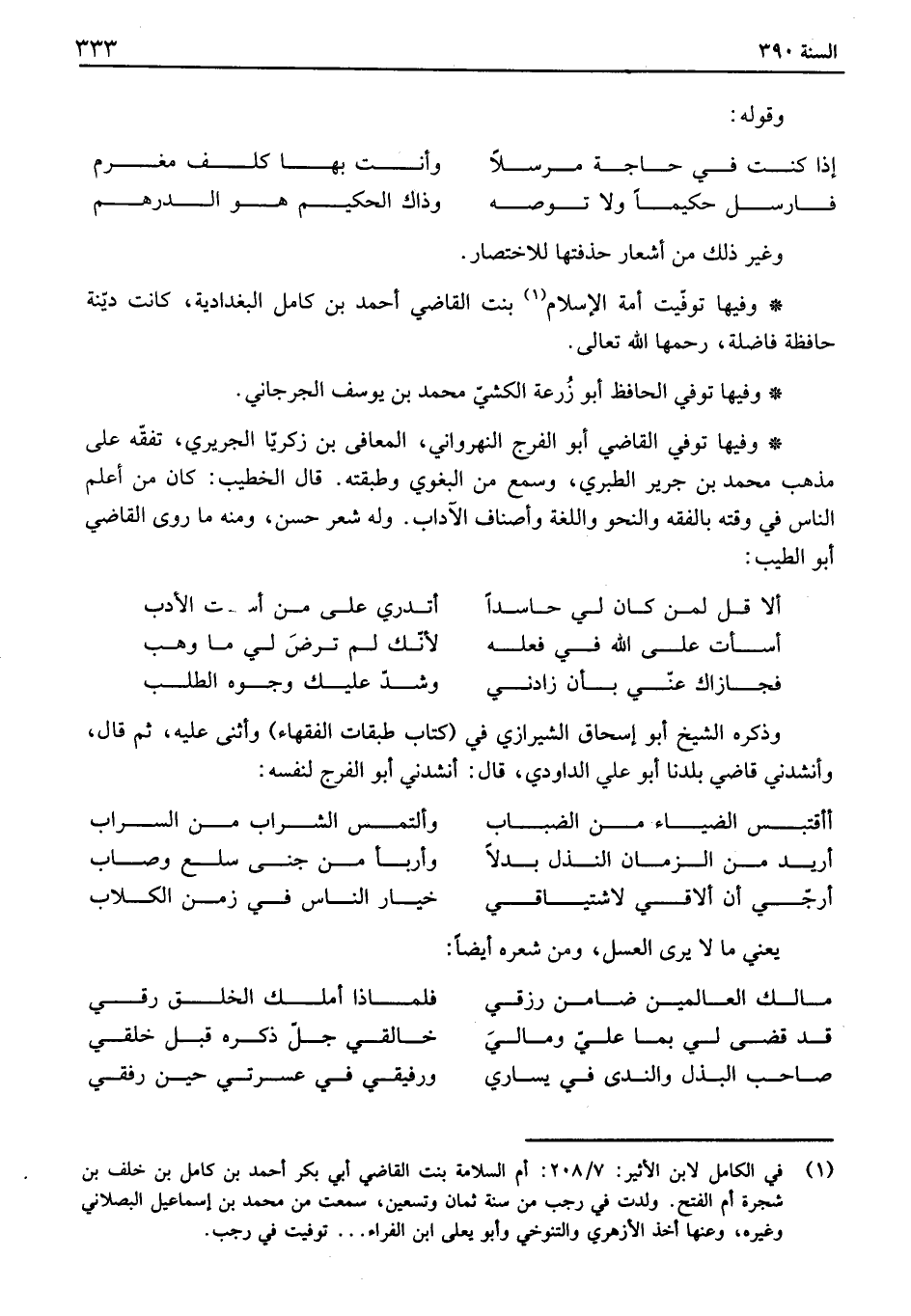 وفيها توفي القاضي أبو الفرج النهرواني، المعافى بن زكريا الجريري، تفقه على مذهب محمد بن جرير الطبري، وسمع من البغوي وطبقته. قال الخطيب: كان من أعلم الناس في وقته بالفقه والنحو واللغة وأصناف الآداب. وله شعر حسن، ومنه ما روى القاضي أبو الطيب: