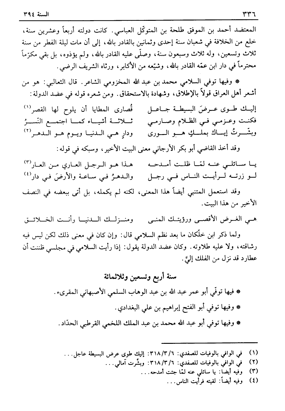 وفيها توفي السلامي محمد بن عبد الله المخزومي الشاعر. قال الثعالبي: هو من أشعر أهل العراق قولاً بالإطلاق، وشهادة بالاستحقاق. ومن شعره قوله في عضد الدولة: