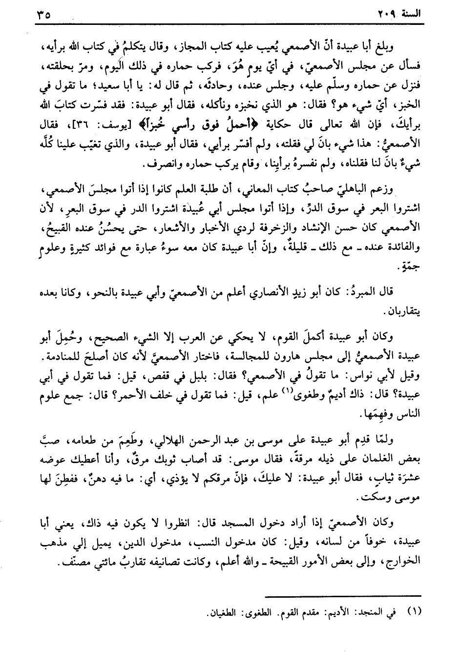 وكان أبو عبيدة كمل القوم، لا يحكي عن العرب إلا الشيء الصحيح، وحمل أبو عبيدة الأصمعي إلى مجلس هارون للمجالسة، فاختار الأصمعي لأنه كان أصلح للمنادمة. وقيل لأبي نواس: ما تقول في الأصمعي. فقال: بلبل في قفص، قيل: فما تقول في أبي عبيدة. قال: ذاك أديم وطغوى علم، قيل: فما تقول في خلف الأحمر؟ قال: جمع علوم الناس وفهمها.