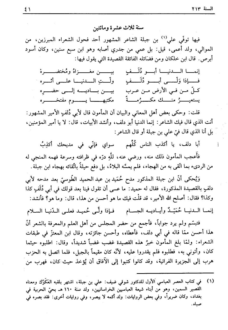 أنت الذي قال فيك الشاعر: إنما الدنيا أبو دلف، وأنشد الأبيات، قال: لا يا أمير المؤمنين، بل أنا الذي قال في علي بن جبلة أو قال الشاعر: