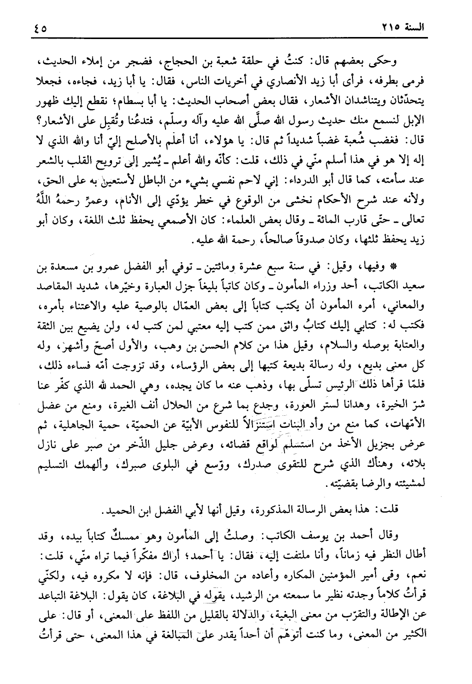 وفيها، وقيل: في سنة سبع عشرة ومائتين توفي أبو الفضل عمرو بن مسعدة بن سعيد الكاتب، أحد وزراء المأمون وكان كاتباً بليغاً جزل العبارة وخيرها، شديد المقاصد والمعاني، أمره المأمون أن يكتب كتاباً إلى بعض العمال بالوصية عليه والإعتناء بأمره، فكتب له: كتابي إليك كتاب واثق ممن كتب إليه معتبي لمن كتب له، ولن يضيع بين الثقة والعتابة بوصله والسلام، وقيل هذا من كلام الحسن بن وهب، والأول أصح وأشهر، وله كل معنى بديع، وله رسالة بديعة كتبها إلى بعض الرؤساء، وقد تزوجت أمه فساءه ذلك، فلما قرأها ذلك الرئيس تسلى بها، وذهب عنه ما كان يجده، وهي الحمد لله الذي كفر عنا شر الخيرة، وهدانا لستر العورة، وجدع بما شرع من الحلال أنف الغيرة، ومع من عضل الأمهات، كما منع من وأد البنات استنزلاً للنفوس الأبية عن الحمية، حمية الجاهلية، ثم عرض بجزيل الأخذ من استسلم لواقع قضائه، وعرض جليل الذخر من صبر على نازل بلائه، وهناك الذي شرح للتقوى صدرك، ووسع في البلوى صبرك، وألهمك التسليم لمشيئته والرضا بقضيته.