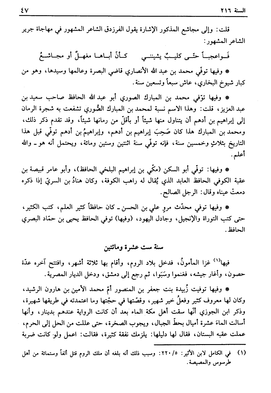 وفيها توفي محمد بن المبارك الصوري أبو عبد الله الحافظ صاحب سعيد بن عبد العزيز، قلت: وهذا الإسم نسبة لمحمد بن المبارك الصوري تشفعت به شجرة الرمان إلى إبراهيم بن أدهم أن يتناول منها شيئاً أو بأقل من رمانها شيئاً، وقد تقدم ذكر ذلك، ومحمد بن المبارك هذا كان صحب إبراهيم بن أدهم، وإبراهيم بن أدهم توفي قبل هذا التاريخ بثلاث وخمسين سنه، فإنه توفي سنة اثنتين وستين ومائة، ويحتمل أنه هو والله أعلم.