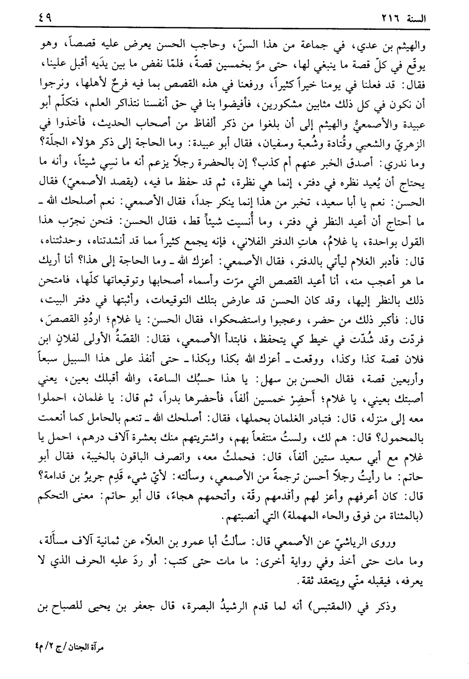 والهيثم إلى أن بلغوا من ذكر ألفاظ من أصحاب الحديث، فأخذوا في الزهري والشعبي وقتادة وشعبة وسفيان، فقال أبو عبيدة: وما الحاجة إلى ذكر هؤلاء الجلة. وما ندري: أصدق الخبر عنهم أم كذب. إن بالحضرة رجلاً يزعم أنه ما نسي شيئاً، وأنه ما يحتاج أن يعيد نظره في دفتر، إنما هي نظرة، ثم قد حفظ ما فيه، " يقصد الأصمعي " فقال الحسن: نعم يا أبا سعيد، تخبر من هذا إنما ينكر جداً، فقال الأصمعي: نعم أصلحك الله ما أحتاج أن أعيد النظر في دفتر، وما أنسيت شيئاً قط، فقال الحسن: فنحن نجرب هذا القول بواحدة، يا غلام، هات الدفتر الفلاني، فإنه يجمع كثيراً مما قد أنشدتناه، وحدثتناه، قال: فأدبر الغلام ليأتي بالدفتر، فقال الأصمعي: أعزك الله وما الحاجة إلى هذا. أنا أريك ما هو أعجب منه، أنا أعيد القصص التي مرت وأسماء أصحابها وتوقيعاتها كلها، فامتحن ذلك بالنظر إليها، وقد كان الحسن قد عارض بتلك التوقيعات، وأثبتها في دفتر البيت، قال: فأكبر ذلك من حضر، وعجبوا واستضحكوا، فقال الحسن: يا غلام، اردد القصص، فردت وقد شدت في خيط كي يتحفظ، فابتدأ الأصمعي، فقال: القصة الأولى لفلان ابن فلان قصة كذا وكذا، ووقعت أعزك الله بكذا وبكذا - حتى أنفذ على هذا السبيل سبعاً وأربعين قصة، فقال الحسن بن سهل: يا هذا حسبك الساعة، والله أقبلك بعين، يعني أصبتك بعيني، يا غلام، أحضر خمسين ألفاً، فأحضرها بحراً، ثم قال: يا غلمان، احملوا معه إلى منزله، قال: فتبادر الغلمان بحملها، فقال: أصلحك الله تنعم بالحامل كما أنعمت بالمحمول. قال: هم لك، ولست منتفعاً بهم، واشتريتهم منك بعشرة آلاف درهم، احمل يا غلام مع أبي سعيد ستين ألفاً، قال: فحملت معه، وانصرف الباقون بالخيبة، فقال أبو حاتم: ما رأيت رجلاً أحسن ترجمة من الأصمعي، وسألته: لأي شيء قدم جرير بن قدامة. قال: كان أعرفهم وأعز لهم وأقدمهم رقة، وأتحمهم هجاء، قال أبو حاتم: معنى التحكم " بالمثناة من فوق والحاء المهملة " التي أنصبتهم.
