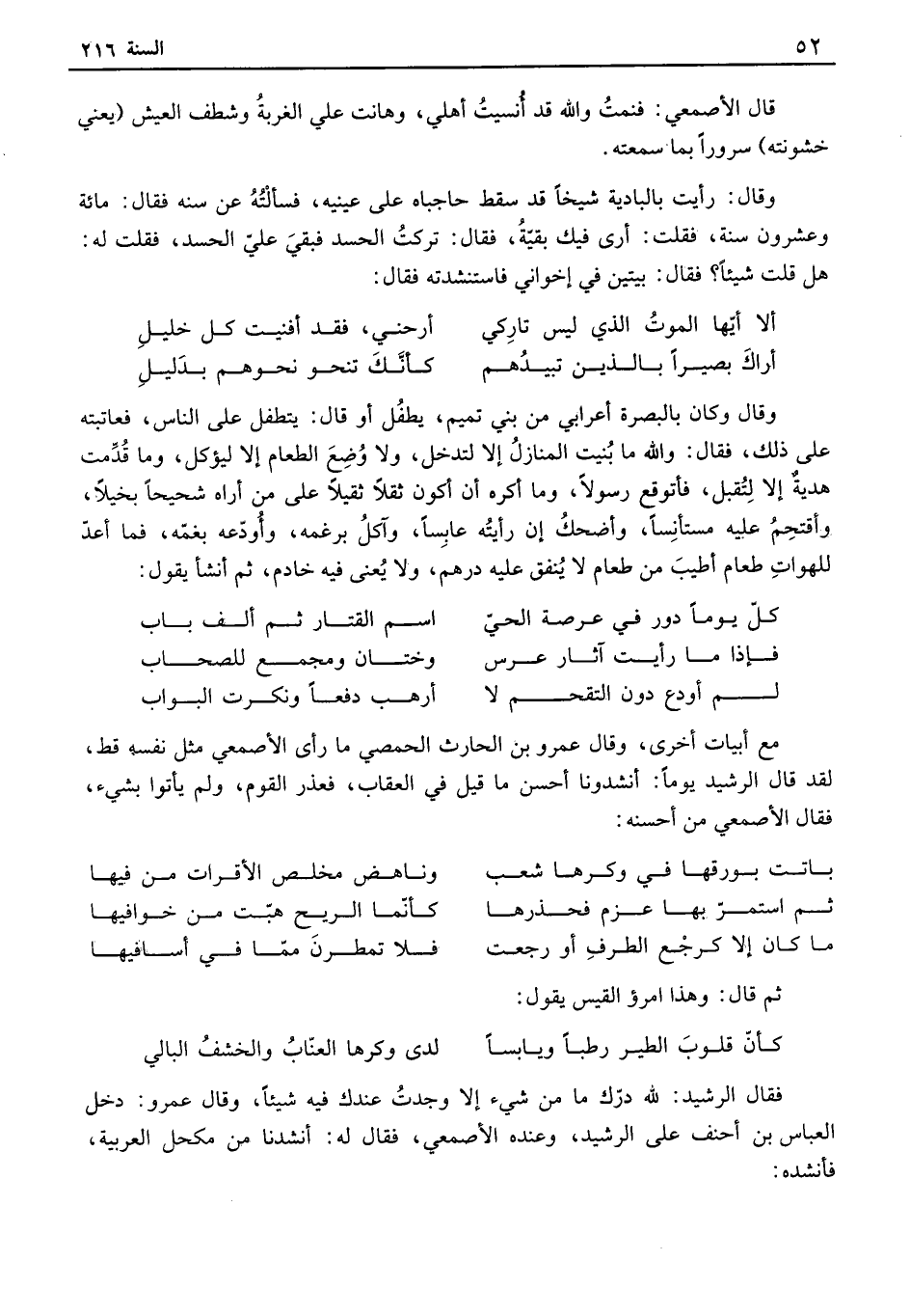 مع أبيات أخرى، وقال عمرو بن الحارث الحمصي ما رأى الأصمعي مثل نفسه قط، لقد قال الرشيد يوماً: أنشدونا أحسن ما قيل في العقاب، فعذر القوم، ولم يأتوا بشيء، فقال الأصمعي من أحسنه: