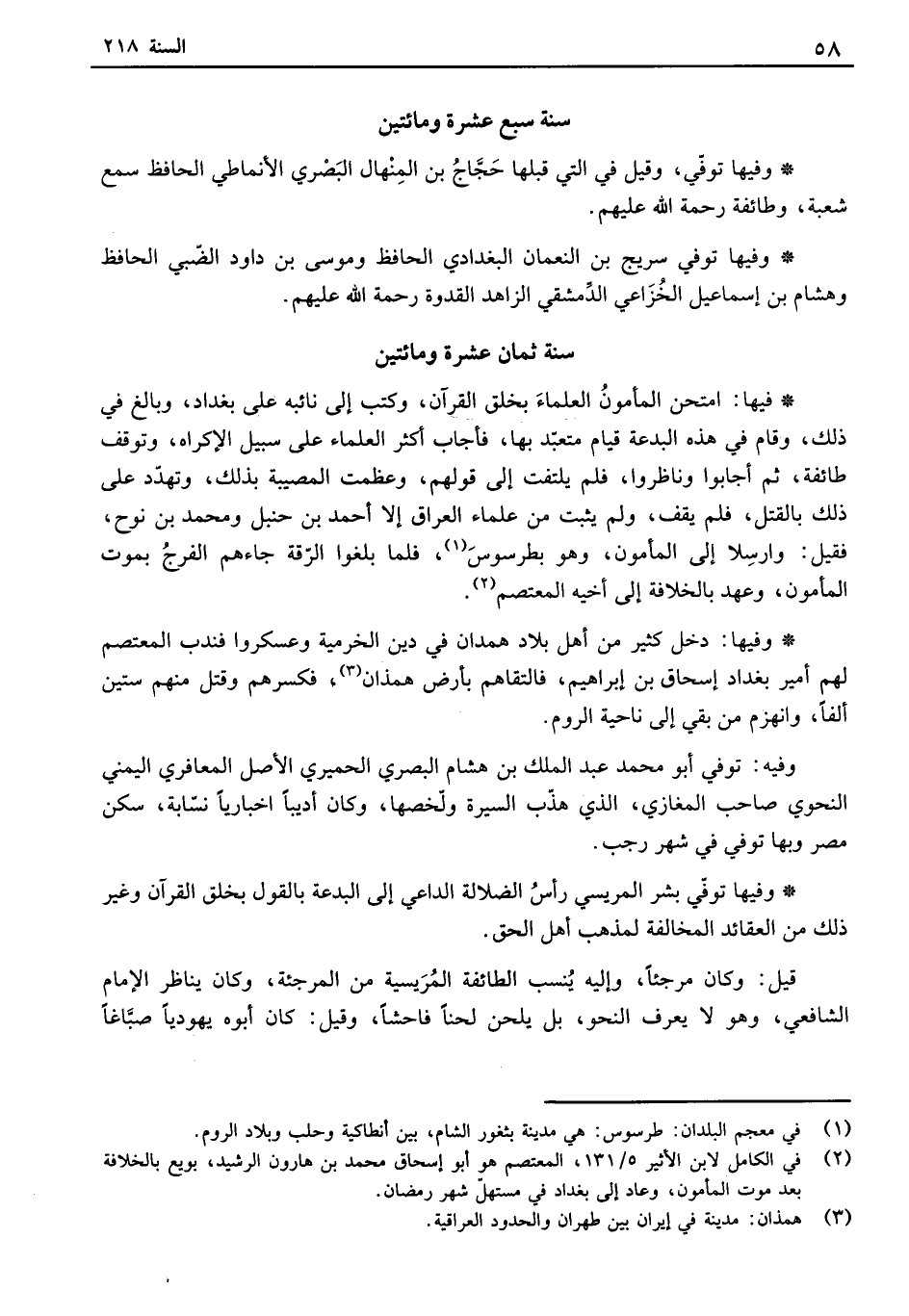 فيها: امتحن المأمون العلماء بخلق القرآن، وكتب إلى نائبه على بغداد، وبالغ في ذلك، وقام في هذه البدعة قيام متعبد بها، فأجاب أكثر العلماء على سبيل الإكراه، وتوقف طائفة، ثم أجابوا وناظروا، فلم يلتفت إلى قولهم، وعظمت المصيبة بذلك، وتهدد على ذلك بالقتل، فلم يقف، ولم يثبت من علماء العراق إلا أحمد بن حنبل ومحمد بن نوح، قيل: وارسلا إلى المأمون، وهو بطرسوس، فلما بلغوا الرقة جاءهم الفرج بموت المأمون، وعهد بالخلافة إلى أخيه المعتصم.