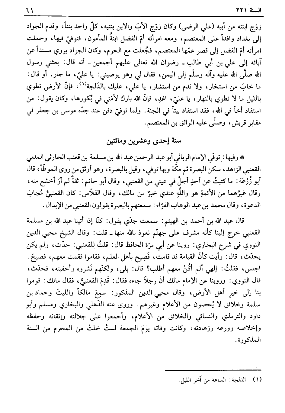 وفيها: توفي الإمام الرباني أبو عبد الرحمن عبد الله بن مسلمة بن قعنب الحارثي المدني القعنبي الزاهد، سكن البصرة ثم مكة وبها توفي، وقيل بالبصرة، وهو أوثق من روى الموطأ، قال أبو زرعة: ما كتبت عن أحد أجل في عيني من القعنبي، وقال أبو حاتم: ثقة لم أر أخشع منه، وقال غيرهما من الأئمة هو والله عندي خير من مالك، وقال الفلاس: كان القعنبي مجاب الدعوة، وقال محمد بن عبد الوهاب الفراء: سمعتهم بالبصرة يقولون القعنبي من الإبدال.