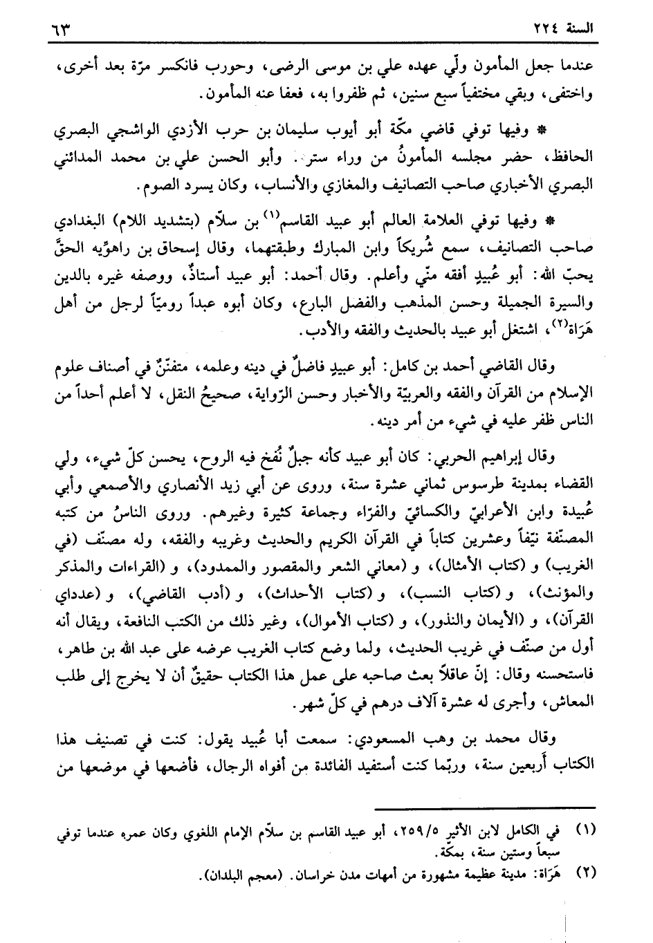 وفيها توفي العلامة العالم أبو عبيد القاسم بن سلام " بتشديد اللام " البغدادي صاحب التصانيف، سمع شريكاً وابن المبارك وطبقتهما، وقال إسحاق بن راهويه الحق يحدث الله: أبو عبيد أفقه مني وأعلم. وقال أحمد: أبو عبيد أستاذ، ووصفه غيره بالدين والسيرة الجميلة وحسن المذهب والفضل البارع، وكان أبوه عبداً رومياً لرجل من أهل هراة، اشتغل أبو عبيد بالحديث والفقه والأدب.