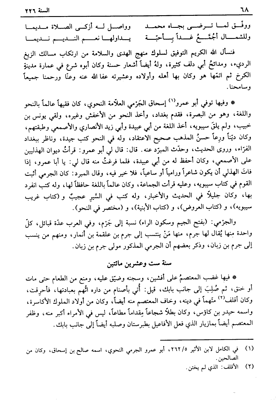 وفيها توفي أبو عمرو إسحاق الجرمي العلامة النحوي، كان فقيهاً عالماً بالنحو واللغة، وهو من البصرة، فقدم بغداد، وأخذ النحو من الأخفش وغيره، ولقي يونس بن خبيب، ولم يلق سيبويه، أخذ اللغة من أبي عبيدة وأبي زيد الأنصاري والأصمعي وطبقتهم، وكان ديناً ورعاً حسن المذهب صحيح الإعتقاد، وله في النحو كتب جيدة، وناظر ببغداد الفراء، وروى الحديث، وحدث المبرد عنه. قال: قال لي أبو عمرو: قرأت ديوان الهذليين على الأصمعي، وكان أحفظ له من أبي عبيدة فلما فرغت منه قال لي: يا أبا عمرو، إذا فات الهذلي أن يكون شاعراً ورامياً أو ساعياً، فلا خير فيه، وقال المبرد: كان الجرمي أثبت القوم في كتاب سيبويه، وعليه قرأت الجماعة، وكان عالماً باللغة حافظاً لها، وله كتب انفرد بها، وكان جليلاً في الحديث والأخبار، وله كتب في السير عجيب و " كتاب غريب سيبويه "، و " كتاب العروض "، و " كتاب الأبنية "، و " مختصر في النحو ".