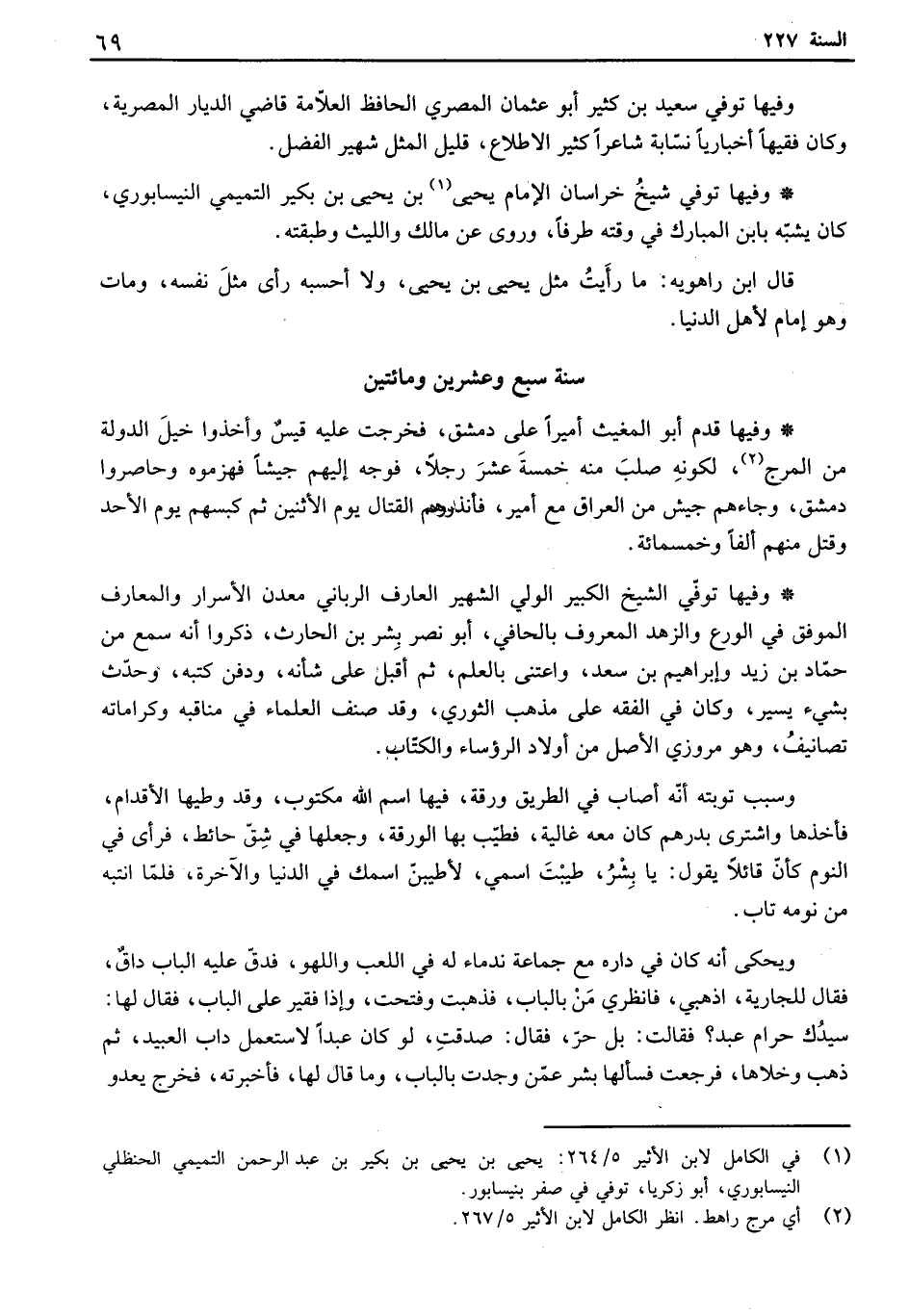 وفيها توفي الشيخ الكبير الولي الشهير العارف الرباني معدن الأسرار والمعارف الموفق في الورع والزهد المعروف بالحافي، أبو نصر بشر بن الحارث، ذكروا أنه سمع من حماد بن زيد وإبراهيم بن سعد، واعتنى بالعلم، ثم أقبل على شأنه، ودفن كتبه، وحدث بشيء يسير، وكان في الفقه على مذهب الثوري، وقد صنف العلماء في مناقبه وكراماته تصانيف، وهو مروزي الأصل من أولاد الرؤساء والكتاب.