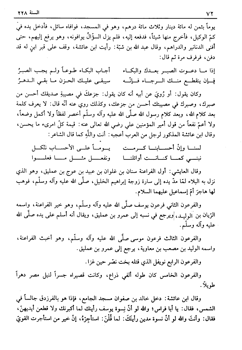 يوماً يثمن له مائة دينار وثلاث مائة درهم، وهو في المسجد، فوافاه سائل، فأدخل يده في كم الوكيل، فأخرج منها شيئاً، فدفعه إليه، فلم يزل السؤال يوافونه، وهو يرفع إليهم، حتى أفنى الدنانير والدراهم، وقال عبد الله بن شبة: رأيت ابن عائشة، وقف على قبر ابن له قد دفن، فرفرف مرة ثم قال: