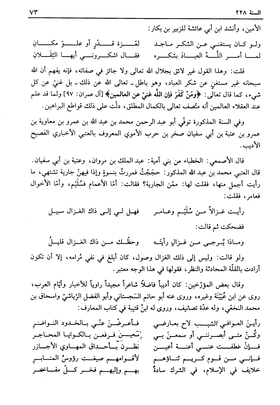 وفي السنة المذكورة توفي أبو عبد الرحمن محمد بن عبد الله بن عمرو بن معاوية بن عمرو بن عتبة بن أبي سفيان صخر بن حرب الأموي المعروف بالعتبي الأخباري الفصيح الأديب.