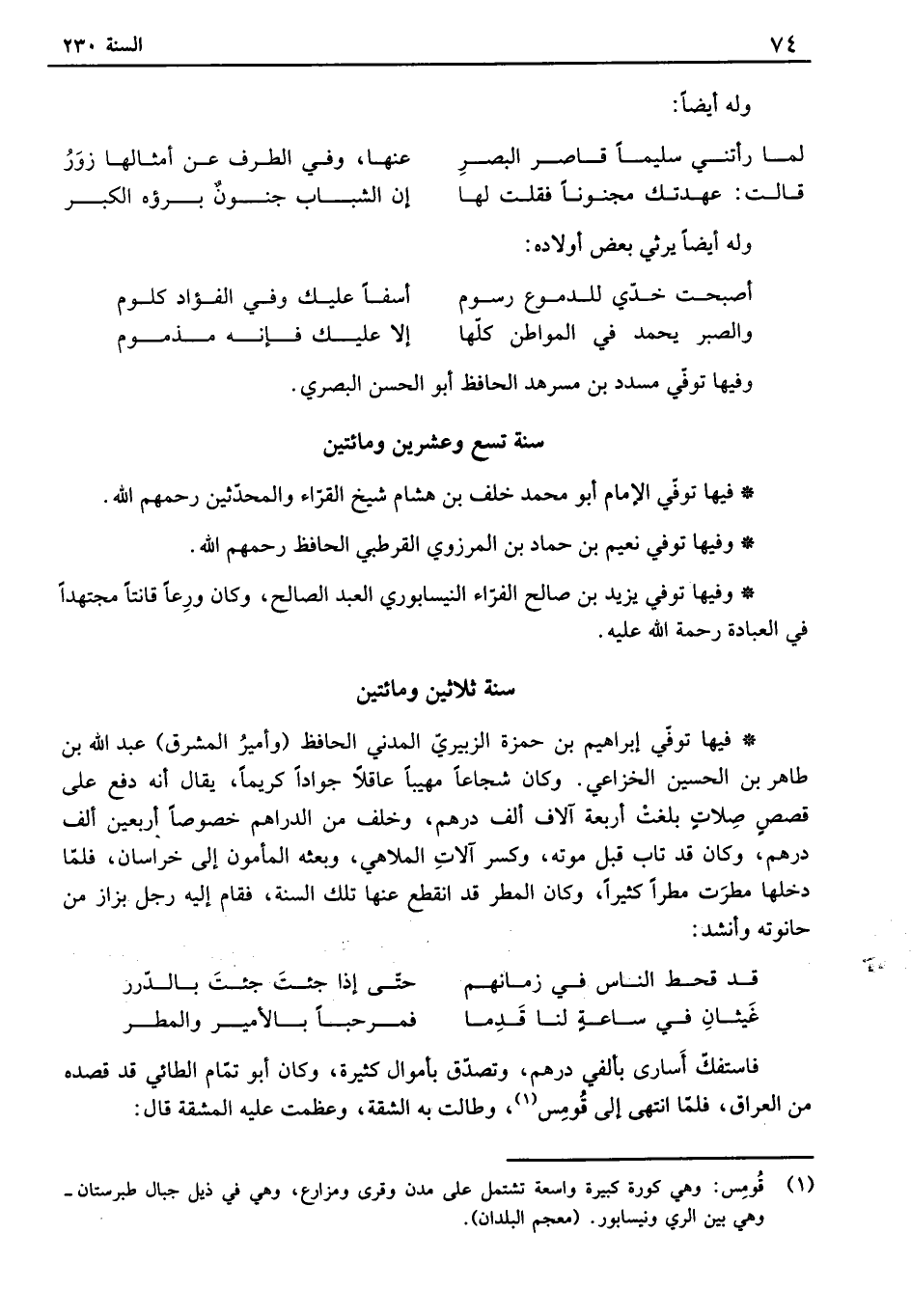 فيها توفي إبراهيم بن حمزة الزبيري المدني الحافظ " وأمير المشرق " عبد الله بن طاهر بن الحسين الخزاعي. وكان شجاعاً مهيباً عاقلاً جواداً كريماً، يقال أنه دفع على قصص صلات بلغت أربعة آلاف ألف درهم، وخلف من الدراهم خصوصاً أربعين ألف درهم، وكان قد تاب قبل موته، وكسر آلات الملاهي، وبعثه المأمون إلى خراسان، فلما دخلها مطرت مطراً كثيراً، وكان المطر قد انقطع عنها تلك السنة، فقام إليه رجل بزاز من حانوته وأنشد:
