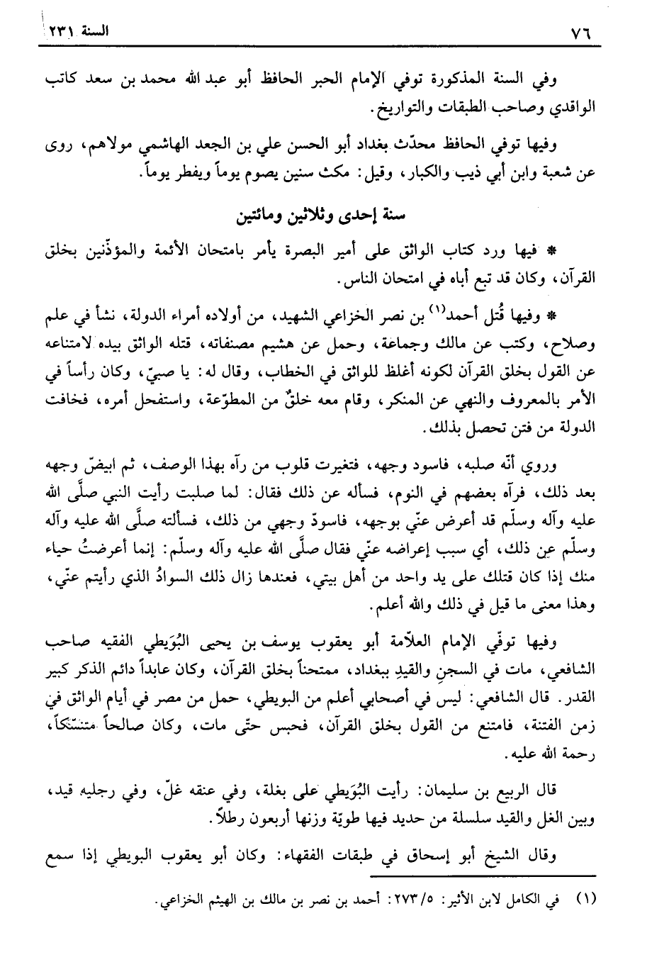 وفيها قتل أحمد بن نصر الخزاعي الشهيد، من أولاده أمراء الدولة، نشأ في علم وصلاح، وكتب عن مالك وجماعة، وحمل عن هشيم مصنفاته، قتله الواثق بيده لإمتناعه عن القول بخلق القرآن لكونه أغلظ للواثق في الخطاب، وقال له: يا صبي، وكان رأساً في الأمر بالمعروف والنهي عن المنكر، وقام معه خلق من المطوعة، واستفحل أمره، فخافت الدولة من فتن تحصل بذلك.