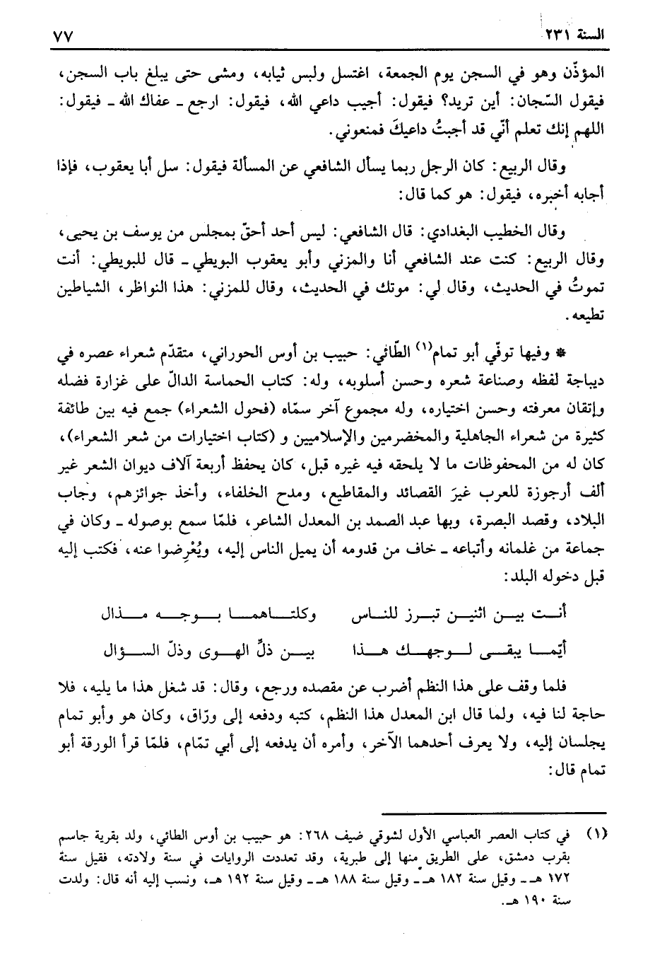 وفيها توفي أبو تمام الطائي: حبيب بن أوس الحوراني، متقدم شعراء عصره في ديباجة لفظه وصناعة شعره وحسن أسلوبه، وله: كتاب الحماسة الدال على غزارة فضله واتقان معرفته وحسن اختياره، وله مجموع آخر سماه " فحول الشعراء " جمع فيه بين طائفة كثيرة من شعراء الجاهلية والمخضرمين والإسلاميين و " كتاب اختيارات من شعر الشعراء "، كان له من المحفوظات ما لا يلحقه فيه غيره قبل، كان يحفظ أربعة آلاف ديوان الشعر غير ألف أرجوزة للعرب غير القصائد والمقاطيع، ومدح الخلفاء، وأخذ جوائزهم، وجاب البلاد، وقصد البصرة، وبها عبد الصمد بن المعدل الشاعر، فلما سمع بوصوله وكان في جماعة من غلمانه وأتباعه خاف من قدومه أن يميل الناس إليه، ويعرضوا عنه، فكتب إليه قبل دخوله البلد: