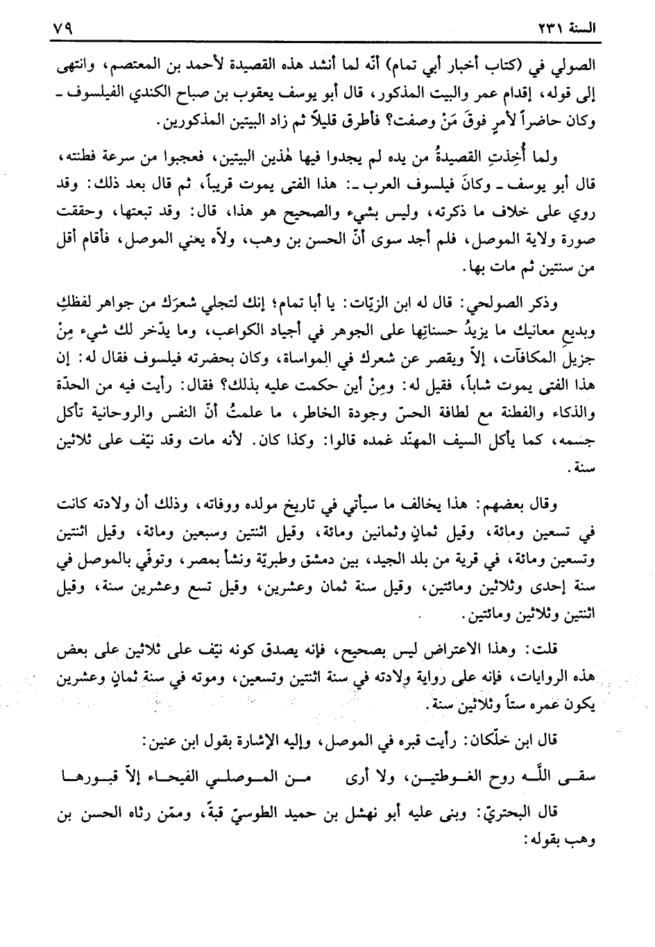 ولما أخذت القصيدة من يده لم يجدوا فيها هذين البيتين، فعجبوا من سرعة فطنته، قال أبو يوسف وكان فيلسوف العرب: هذا الفتى يموت قريباً، ثم قال بعد ذلك: وقد روي على خلاف ما ذكرته، وليس بشيء والصحح هو هذا، قال: وقد تبعتها، وحققت صورة ولاية الموصل، فلم أجد سوى أن الحسن بن وهب، ولآه يعني الموصل، فأقام أقل من سنتين ثم مات بها.
