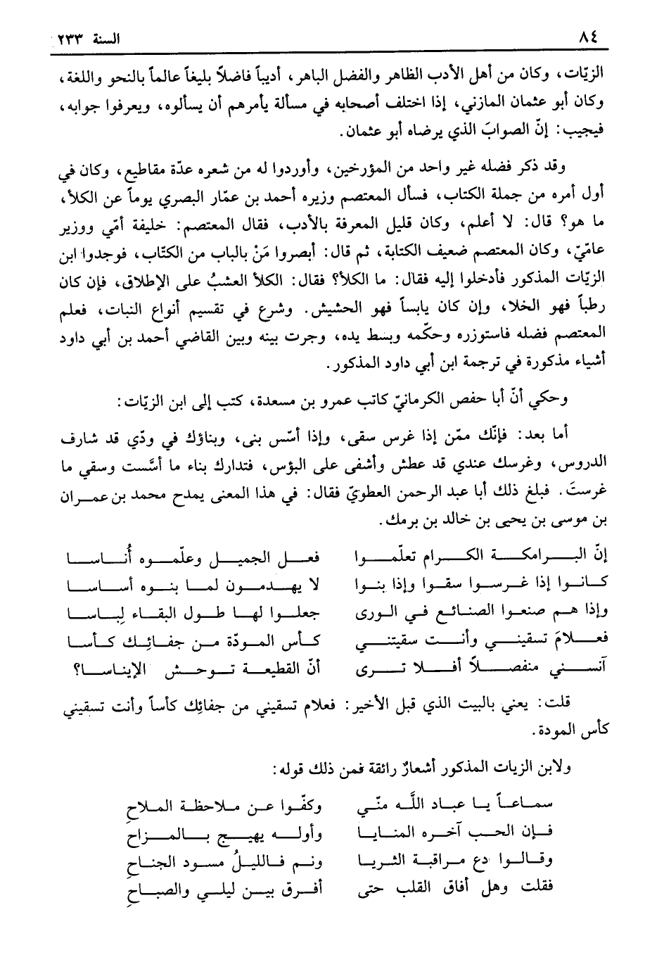 الزيات، وكان من أهل الأدب الظاهر والفضل الباهر، أديباً فاضلاً بليغاً عالماً بالنحو واللغة، وكان أبو عثمان المازني، إذا اختلف أصحابه في مسألة يأمرهم أن يسألوه، ويعرفوا جوابه، فيجيب: إن الصواب الذي يرضاه أبو عثمان.