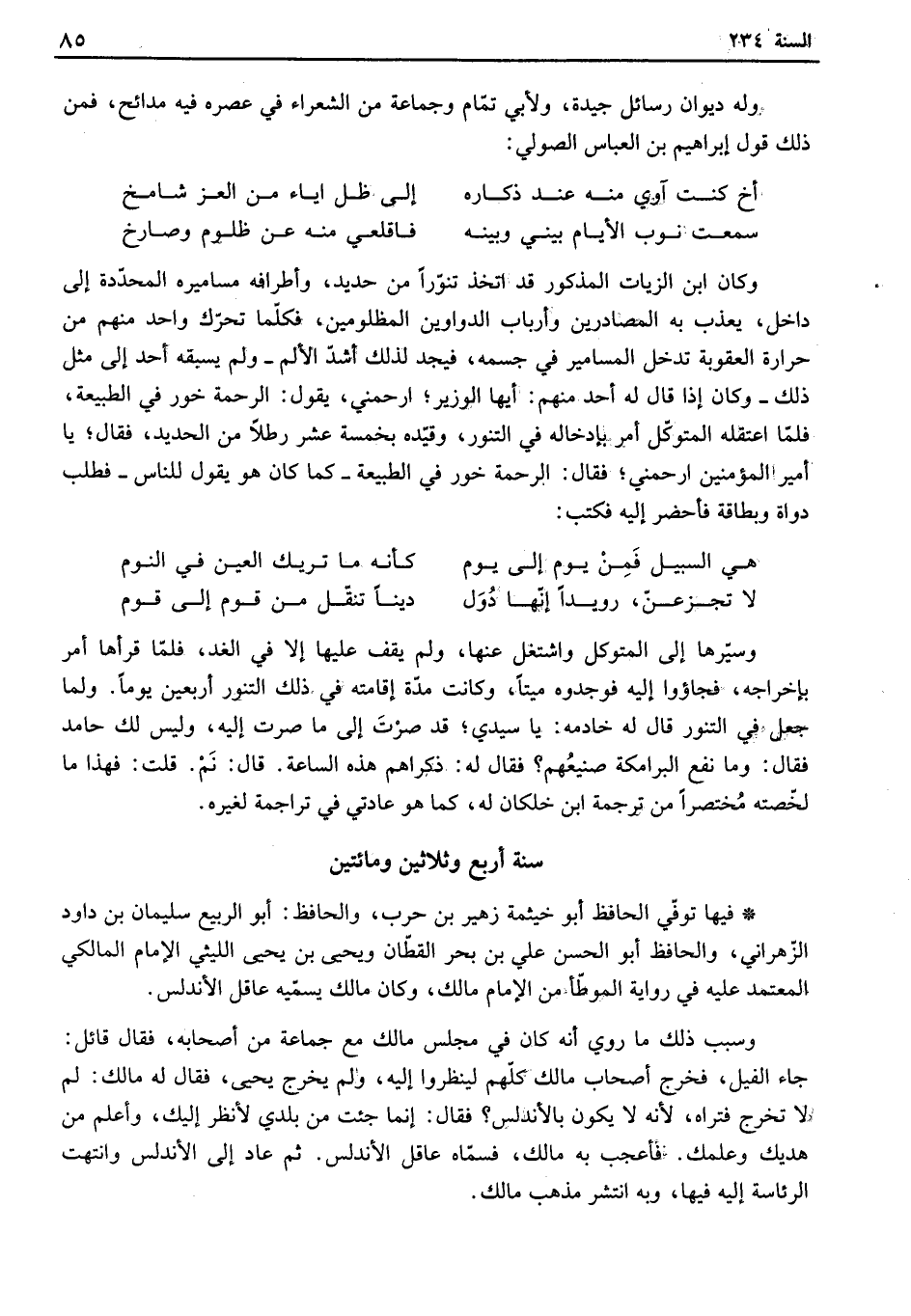 وسيرها إلى المتوكل واشتغل عنها، ولم يقف عليها إلا في الغد، فلما قرأها أمر بإخراجه، فجاؤوا إليه فوجدوه ميتاً، وكانت مدة إقامته في ذلك التنور أربعين يوماً. ولما جعل في التنور قال له خادمه: يا سدي، قد صرت إلى ما صرت إليه، وليس لك حامد فقال: وما نفع البرامكة صنيعهم؟ فقال له: ذكراهم هذه الساعة. قال: نعم. قلت: فهذا ما لخصته مختصراً من ترجمة ابن خلكان له، كما هو عادتي في تراجمة لغيره.