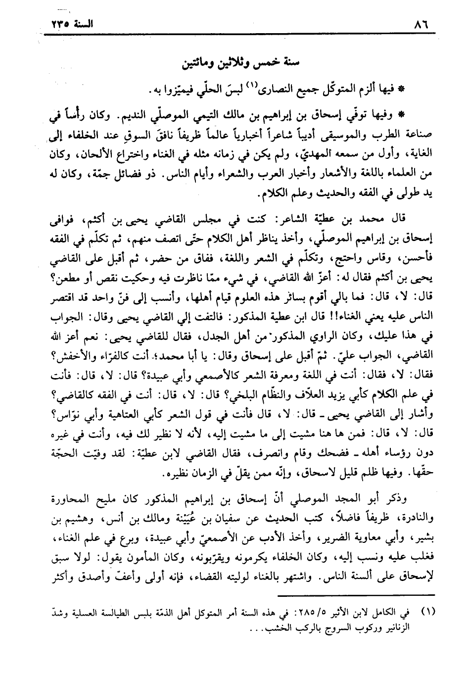 وفيها توفي إسحاق بن إبراهيم بن مالك التيمي الموصلي النديم. وكان رأساً في صناعة الطرب والموسيقى أديباً شاعراً أخبارياً عالماً ظريفاً نافق السوق عند الخلفاء إلى الغاية، وأول من سمعه المهدي، ولم يكن في زمانه مثله في الغناء واختراع الألحان، وكان من العلماء باللغة والأشعار وأخبار العرب والشعراء وأيام الناس. ذو فضائل جمة، وكان له يد طولى في الفقه والحديث وعلم الكلام.