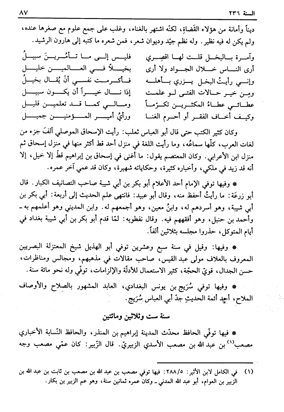 فيها توفي الحافظ محدث المدينة إبراهيم بن المنذر، والحافظ النسابة الأخبار مصعب بن عبد الله بن مصعب الأسدي الزبيري. قال الزبير: كان عمي مصعب وجه