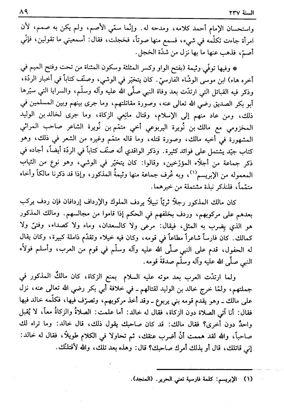 وفيها توفي وثيمة " بفتح الواو وكسر المثلثة وسكون المثناة من تحت وفتح الميم في أخره هاء " ابن موسى الوشاء الفارسي. كان يتخير في الوشي، وصنف كتاباً في أخبار الرقة وذكر فيه القبائل التي ارتدت بعد وفاة النبي صلى الله عليه وآله وسلم، والسرايا التي سيرها أبو بكر الصديق رضي الله تعالى عنه، وصورة مقاتلتهم، وما جرى بينهم وبين المسلمين في ذلك، ومن عاد منهم إلى الإسلام، وقتال مانعي الزكاة، وما جرى لخالد بن الوليد المخزومي مع مالك بن نويرة اليربوعي أخي متمم بن نويرة الشاعر صاحب المراثي المشهورة في أخيه مالك، وصورة قتله، وما قاله متمم وغيره من الشعر في ذلك، وهو كتاب جيد يشتمل على فوائد كثيرة. وذكر الواقدي أنه صنف كتاباً في الردة أيضاً، أجاده في ذكر جماعة من أجلاء المؤرخين، وقالوا: كان يتخير في الوشي، وهو نوع من الثياب المعموله من الإبريسم، وبه عرف جماعة منها وثيمة المذكور، وإذا قد ذكرنا مالكاً وأخاه متمماً، فلنذكر نبذة مشتملة من خبرهما.