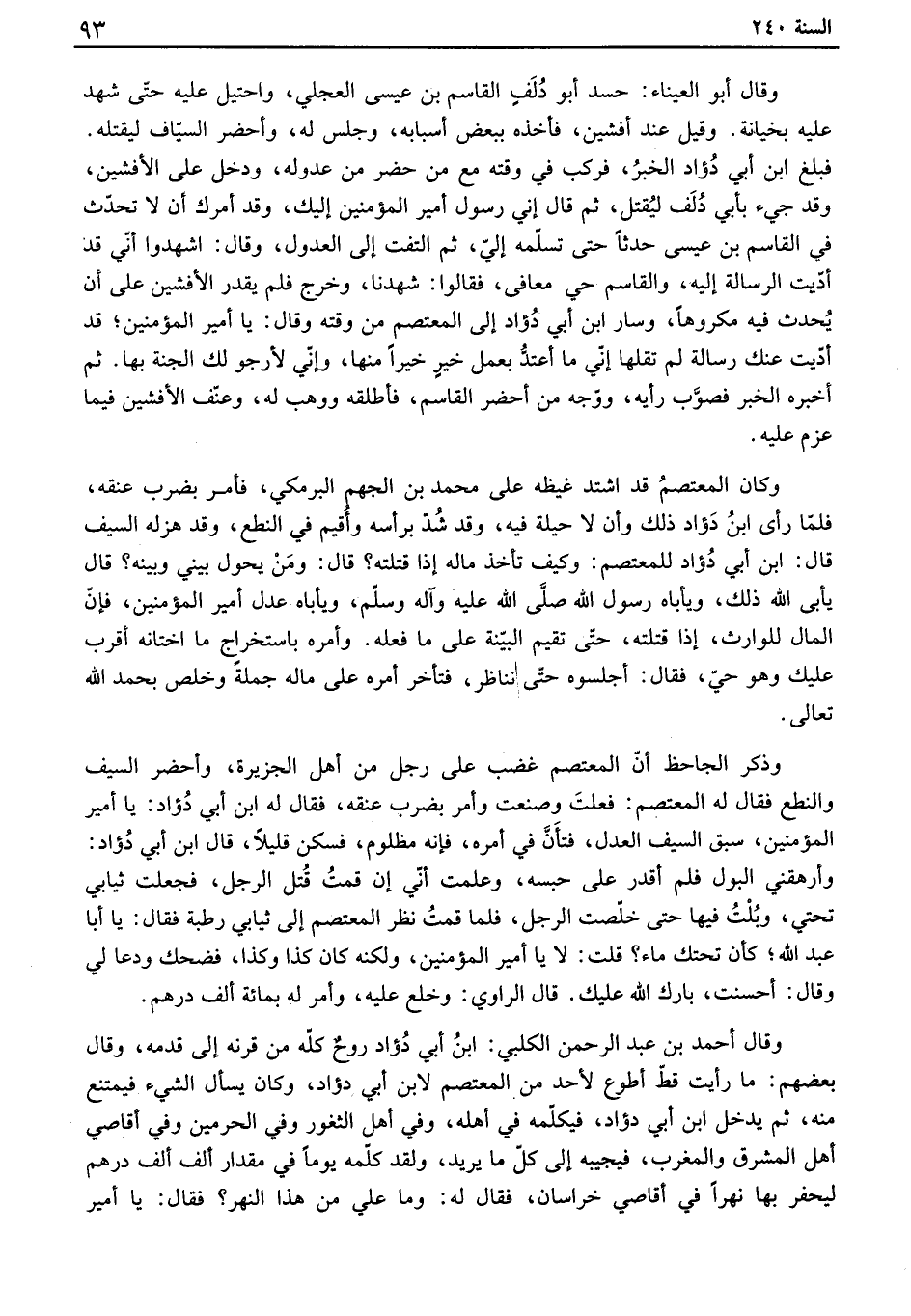 وذكر الجاحظ أن المعتصم غضب على رجل من أهل الجزيرة، وأحضر السيف والنطع فقال له المعتصم: فعلت وصنعت وأمر بضرب عنقه، فقال له ابن أبي دؤاد: يا أمير المؤمنين، سبق السيف العدل، فتأن في أمره، فإنه مظلوم، فسكن قليلاً، قال ابن أبي دؤاد: وأرهقني البول فلم أقدر على حبسه، وعلمت أني إن قمت قتل الرجل، فجعلت ثيابي تحتي، وبلت فيها حتى خلصت الرجل، فلما قمت نظر المعتصم إلى ثيابي رطبة فقال: يا أبا عبد الله، كأن تحتك ماء؟ قلت: لا يا أمير المؤمنين، ولكنه كان كذا وكذا، فضحك ودعا لي وقال: أحسنت، بارك الله عليك. قال الراوي: وخلع عليه، وأمر له بمائة ألف درهم.
