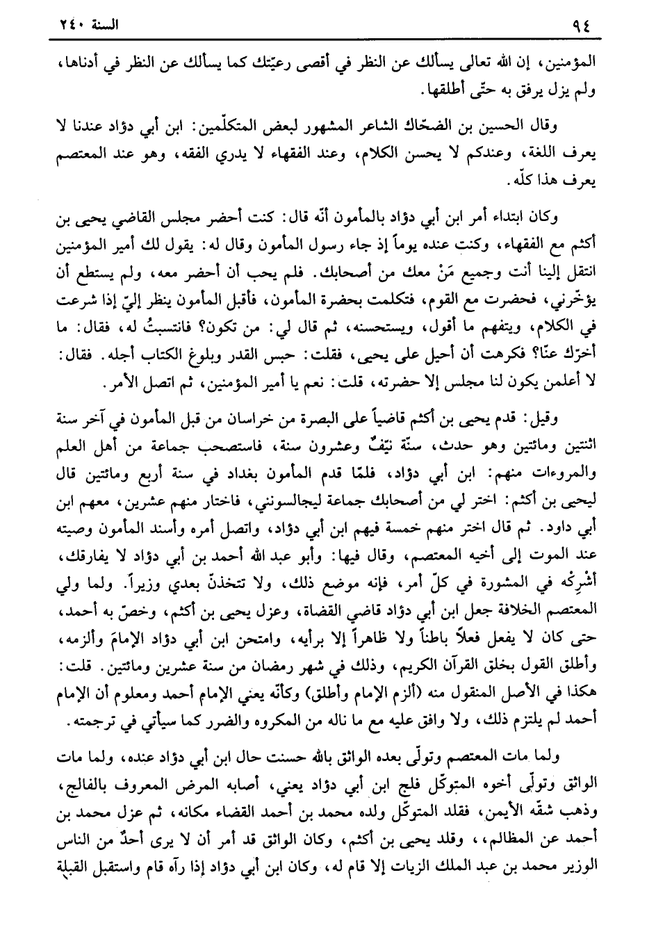ومائتين وهو حدث، سنة نيف وعشرون سنة، فاستصحب جماعة من أهل العلم والمروءات منهم: ابن أبي دؤاد، فلما قدم المأمون بغداد في سنة أربع ومائتين قال ليحيى بن أكثم: اختر لي من أصحابك جماعة ليجالسونني، فاختار منهم عشرين، معهم ابن أبي داود. ثم قال اختر منهم خمسة فيهم ابن أبي دؤاد، واتصل أمره وأسند المأمون وصيته الموت إلى أخيه المعتصم، وقال فيها: وأبو عبد الله أحمد بن أبي دؤاد لا يفارقك، في المشورة في كل أمر، فإنه موضع ذلك، ولا تتخذن بعدي وزيراً. ولما ولي المعتصم الخلافة جعل ابن أبي دؤاد قاضي القضاة، وعزل يحيى بن أكثم، وخص به أحمد، كان لا يفعل فعلاً باطناً ولا ظاهراً إلا برأيه، وامتحن ابن أبي دؤاد الإمام وألزمه، وأطلق القول بخلق القرآن الكريم، وذلك في شهر رمضان من سنة عشرين ومائتين. قلت: في الأصل المنقول منه " ألزم الإمام وأطلق " وكأنه يعني الإمام أحمد ومعلوم أن الإمام أحمد لم يلتزم ذلك، ولا وافق عليه مع ما ناله من المكروه والضرر كما سيأتي في ترجمته.