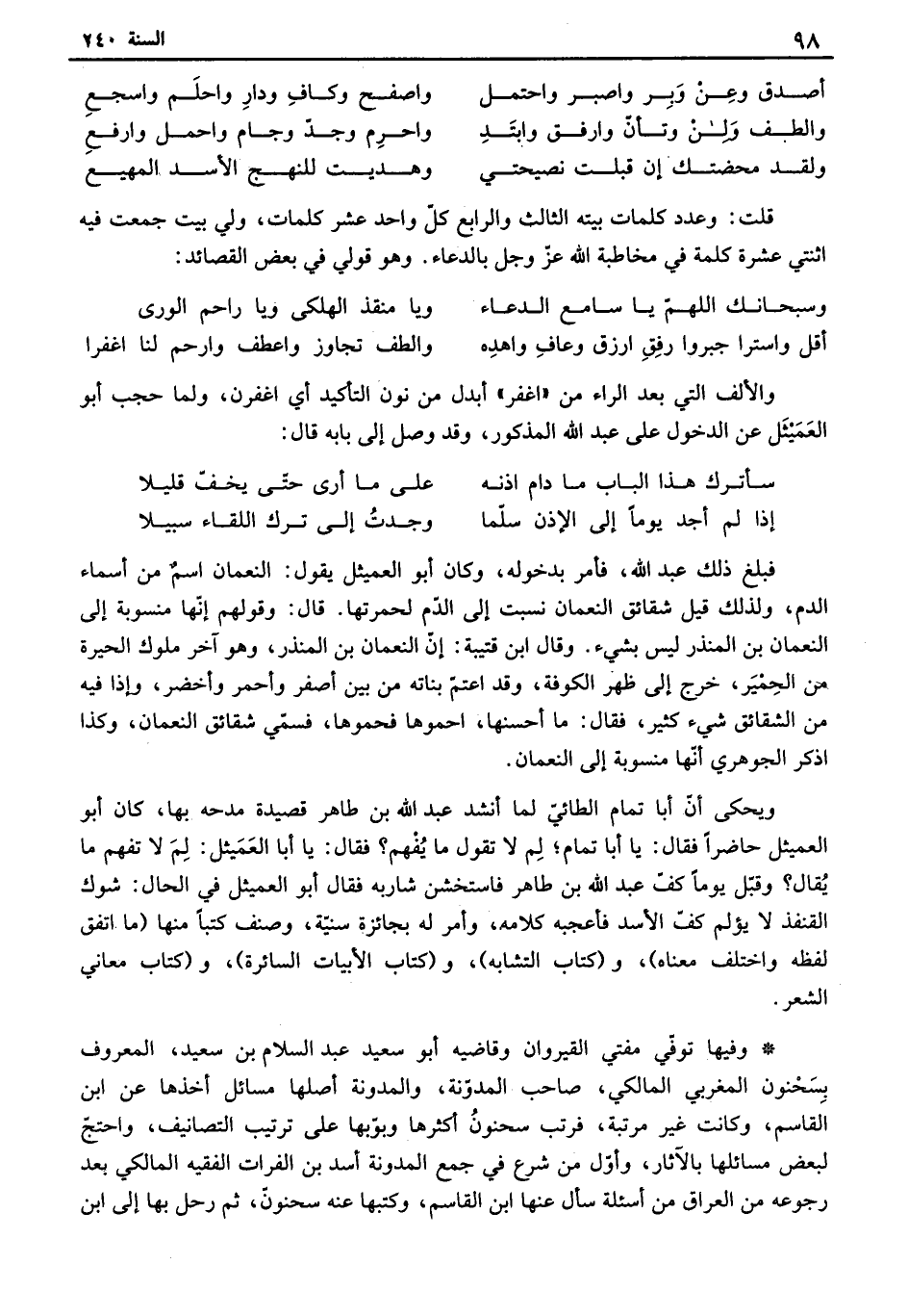 وفيها توفي مفتي القيروان وقاضيه أبو سعيد عبد السلام بن سعيد، المعروف بسحنون المغربي المالكي، صاحب المدونة، والمدونة أصلها مسائل أخذها عن ابن قاسم، وكانت غير مرتبة، فرتب سحنون أكثرها وبوبها على ترتيب التصانيف، واحتج لبعض مسائلها بالآثار، وأول من شرع في جمع المدونة أسد بن الفرات الفقيه المالكي بعد رجوعه من العراق من أسئلة سأل عنها ابن القاسم، وكتبها عنه سحنون، ثم رحل بها إلى ابن