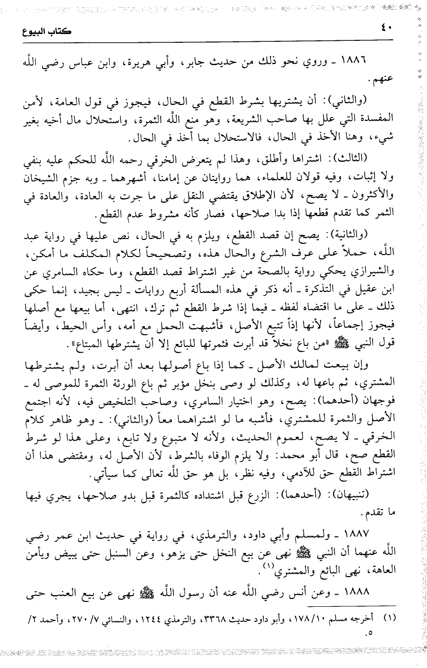 ( الثالث ) : اشتراها وأطلق ، وهذا لم يتعرض الخرقي رحمه اللَّه للحكم عليه بنفي ولا إثبات ، وفيه قولان للعلماء ، هما روايتان عن إمامنا ، أشهرهما وفيه قولان للعلماء ، هما روايتان عن إمامنا ، أشهرهما وبه جزم الشيخان والأكثرون لا يصح ، لأن الإطلاق يقتضي النقل على ما جرت به العادة ، والعادة في الثمر كما تقدم قطعها إذا بدا صلاحها ، فصار كأنه مشروط عدم القطع .