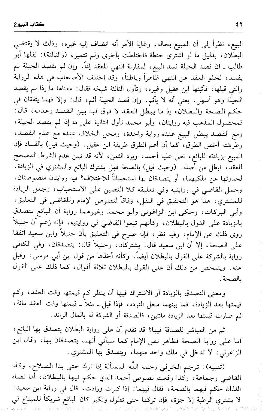 البيع ، نظراً إلى أن المبيع بحاله ، وغاية الأمر أنه انضاف إليه غيره ، وذلك لا يقتضي البطلان ، بدليل ما لو اشترى حنطة فاختلطت بأخرى ولم تتميز ، ( والثالثة ) : نقلها أبو طالب إن قصد الحيلة فسد البيع ، لمقارنة النهي للعقد إذاً ، وإن لم يقصد الحيلة لم يفسد ، لخلو العقد عن النهي ظاهراً وباطناً ، وقد اختلف الأصحاب في هذه الرواية والتي قبلها ، فأثبتها ابن عقيل وغيره ، وتأول الثالثة شيخه فقال : معناها ما إذا لم يقصد الحيلة وهو أسهل ، يعني أنه لا يأثم ، وإن قصد الحيلة أثم ، قال : وإلا فهما يتفقان في حكم الصحة والبطلان ، إذ ما يبطل العقد لا فرق فيه بين القصد وعدمه ، قال : فمحصول المذهب فيه روايتان ، وأبو محمد تأول الثانية على ما إذا لم يقصد الحيلة ، ومع القصد يبطل البيع عنده رواية واحدة ، ومحل الخلاف عنده مع عدم القصد ، وطريقته أخص الطرق ، كما أن عم الطرق طريقة ابن عقيل . ( وحيث قيل ) بالفساد فإن المبيع بزيادته للبائع ، نص عليه أحمد ، ويرد الثمن ، لأنه قد تبين عدم الشرط المصحح للعقد ، فبطل من أصله . ( وحيث قيل ) بالصحة فهل يشترك البائع والمشتري في الزيادة ، لحدوثها عن ملكيهما ، أو يتصدقان بها استحساناً للاختلاف ؟ فيه روايتان منصوصتان ، وحمل القاضي في روايتيه وفي تعليقه كلا النصين على الاستحباب ، وجعل الزيادة للمشتري ، هذا هو التحقيق في النقل ، وفاقاً لنصوص الإمام وللقاضي في التعليق ، وأبي البركات ، وحكى ابن الزاغوني وأبو محمد وغيرهما رواية أن البائع يتصدق بالزيادة على القول بالبطلان ، وكأنهم تبعوا القاضي في روايتيه ، فإنه زعم أن حنبلاً روى ذلك عن الإمام ، وفيه نظر ، فإنه صرح في التعليق بأن حنبلاً وابن سعيد اتفقا على الصحة ، إلا أن ابن سعيد [ قال ] : يشتركان ، وحنبلاً قال : يتصدقان ، وفي الكافي رواية بالشركة على القول بالبطلان أيضاً ، وكأنه أخذها من قول ابن أبي موسى : وقيل عنه . ويتلخص من ذلك أن على القول بالبطلان ثلاثة أقوال ، كما ذلك على القول بالصحة .