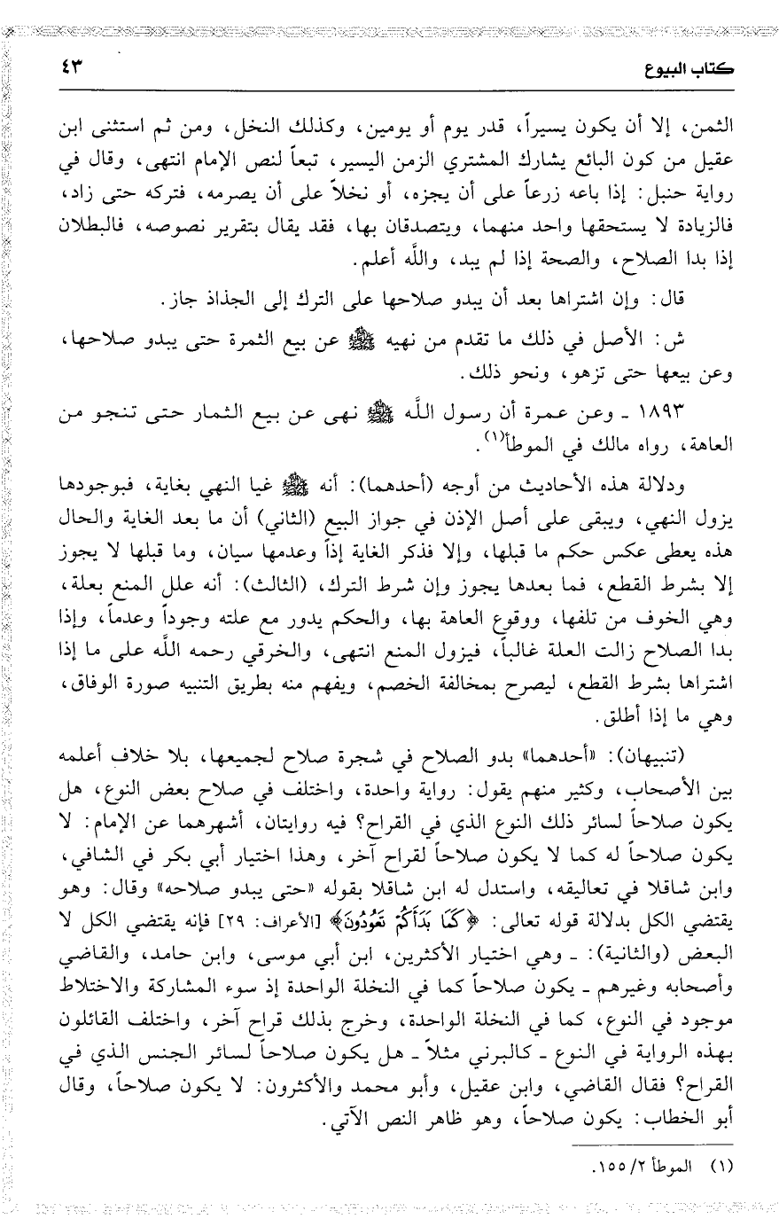 ( تنبيهان ) : ( أحدهما ) بدو الصلاح في شجرة صلاحج لجميعها ، بلا خلاف أعلمه بين الأصحاب ، وكثير منهم يقول : رواية واحدة ، واختلف في صلاح بعض النوع ، هل يكون صلاحاً [ لسائر ذلك النوع الذي في القراح ؟ فيه روايتان ، أشهرهما عن الإمام : لا يكون صلاحاً له كما لا يكون صلاحاً ] لقراح آخر ، وهذا اختيار أبي بكر في الشافي ، وابن شاقلا في تعاليقه ، واستدل له ابن شاقلا بقوله ( حتى يبدو صلاحه ) وقال : وهو يقتضي الكل بدلالة قوله تعالى : { كما بدأكم تعودون } فإنه يقتضي الكل لا البعض ( والثانية ) : وهي اختيار الأكثرين ، ابن أبي موسى ، وابن حامد ، والقاضي وأصحابه وغيرهم يكون صلاحاً كما في النخلة الواحدة [ إذ سوء المشاركة والاختلاط موجود في النوع ، كما في النخلة الواحدة ] ، وخرج بذلك قراح آخر ، واختلف القائلون بهذه الرواية في النوع كالبرني مثلاً هل يكون صلاحاً لسائر الجنس الذي في القراح ؟ فقال القاضي ، وابن عقيل ، وأبو محمد والأكثرون : لا يكون صلاحاً ، وقال أبو الخطاب : يكون صلاحاً ، وهو ظاهر النص الآتي .