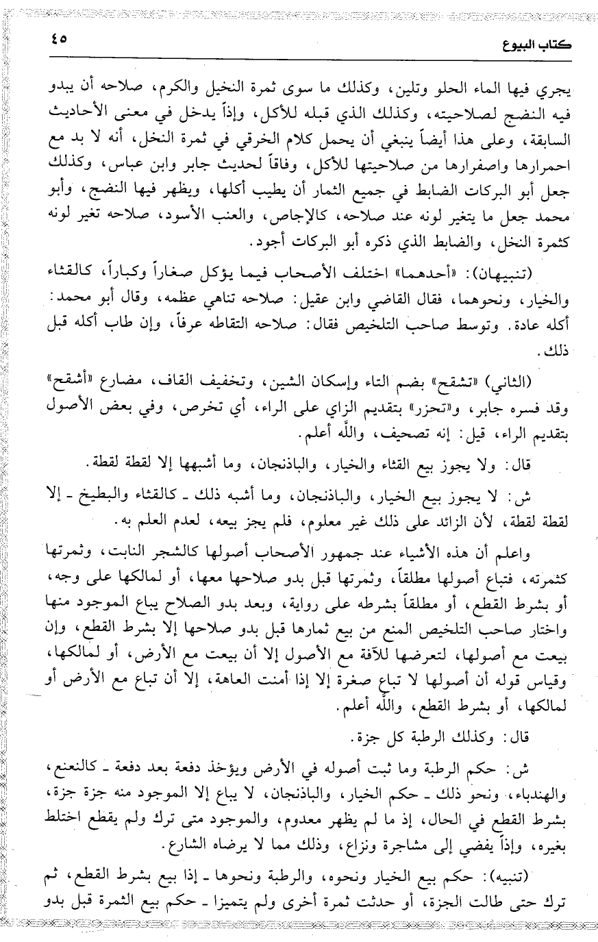 يجري فيها الماء الحلو وتلين ، وكذلك ما سوى ثمرة النخيل والكرم ، صلاحه أن يبدو فيه النضج لصلاحيته ، وكذلك الذي قبله للأكل ، وإذاً يدخل في معنى الأحاديث السابقة ، وعلى هذا أيضاً ينبغي أن يحمل كلام الخرقي في ثمرة النخل ، أنه لا بد مع احمرارها واصفرارها من صلاحيتها للأكل ، وفاقاً لحديث جابر وابن عباس ، وكذلك جعل أبو البركات الضابط في جميع الثمار أن يطيب أكلها ، ويظهر فيها النضج ، وأبو محمد جعل ما يتغير لونه عند صلاحه ، كالإجاص ، والعنب الأسود ، صلاحه تغير لونه كثمرة النخل ، والضابط الذي ذكره أبو البركات أجود .