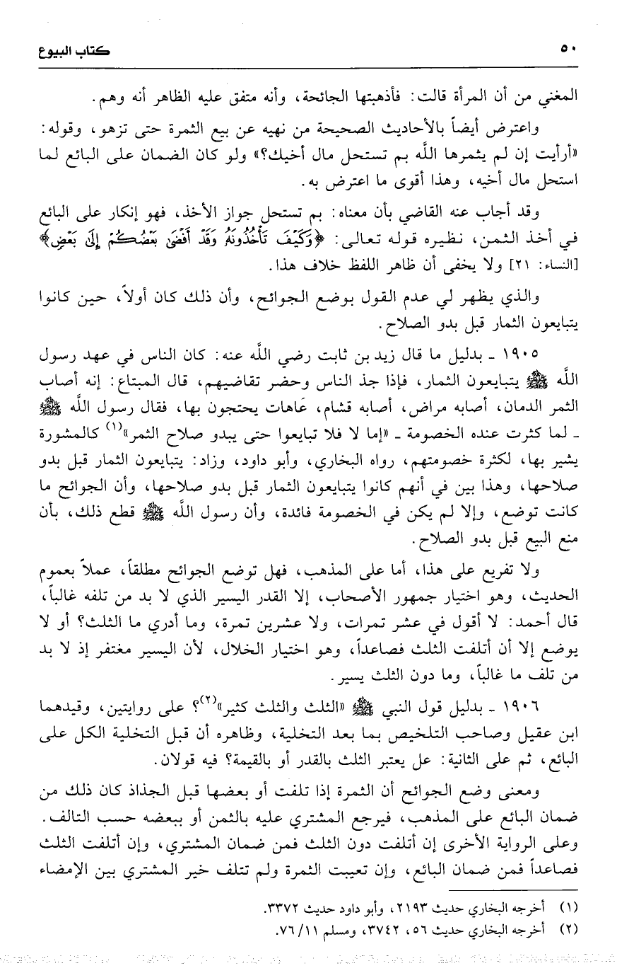 1905 بدليل ما قال زيد بن ثابت رضي اللَّه عنه : كان الناس في عهد رسول اللَّه يتبايعون الثمار ، فإذا جذ الناس وحضر تقاضيهم ، قال المبتاع : إنه أصاب الثمر الدمان ، أصابه مراض ، أصابه قشام ، عاهات يحتجون بها ، فقال رسول اللَّه لما كثرت عنده الخصومة ( إما لا فلا تبايعوا حتى يبدو صلاح الثمر ) كالمشورة يشير بها ، لكثرة خصومتهم ، رواه البخاري ، وأبو داود ، وزاد : يتبايعون الثمار قبل بدو صلاحها ، وهذا بين في أنهم كانوا يتبايعون الثمار [ قبل بدو صلاحها ، وأن الجوائح ما كانت توضع ، وإلا لم يكن في الخصومة فائدة ، وأن رسول اللَّه قطع ذلك ، بأن منع البيع ] قبل بدو الصلاح .