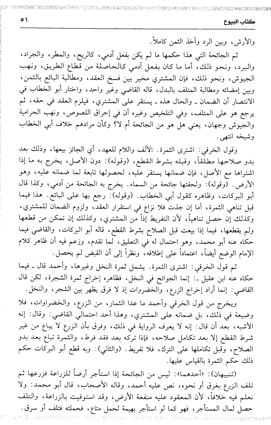 وقول الخرقي : اشترى الثمرة . الألف واللام للعهد ، أي الجائز بيعها ، وذلك بعد بدو صلاحها مطلقاً ، وقبله بشرط القطع ، ( وقوله ) : دون الأصل ، يخرج به ما إذا اشتراها مع الأصل ، فإن ضمانها يستقر عليه ، لحصولها تابعة لما ضمانه عليه ، وهو الأرض . ( وقوله ) : ولحقتها جائحة من السماء . يخرج به الجائحة من آدمي ، وكذا قال أبو البركات ، وظاهره كقول أبي الخطاب . ( وقوله ) : رجع بها على البائع . هذا فيما قبل تناهي الثمرة ، أما إن جذت فلا نزاع في استقرار العقد ، ولزوم الضمان للمشتري ، وكذلك إن حصل تناهياً ، لأن التفريط إذاً من المشتري ، وكذلك إن تمكن من قطعها ولم يقطعها ، فيما إذا بيعت قبل الصلاح بشرط القطع ، قاله أبو البركات ، والقاضي فيما حكاه عنه أبو محمد ، وهو احتمال له في التعليق ، لما تقدم ، وزعم فيه أن ظاهر كلام الإمام الوضع أيضاً ، اعتماداً على إطلاقه ، ونظراً إلى أن القبض لم يحصل .