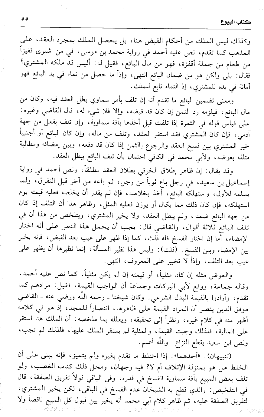 وكذلك ليس الملك من أحكام القبض هنا ، بل يحصل الملك بمجرد العقد ، على المذهب كما تقدم ، نص عليه أحمد في رواية محمد بن موسى ، في من اشترى قفيزاً من طعام من جملة أقفزة ، فهو من مال البائع ، [ فقيل له : أليس قد ملكه المشتري ؟ فقال : بلى ولكن هو من ضمان البائع ] انتهى ، وإذاً ما حصل من نماء في يد البائع فهو أمانة في يده للمشتري ، إذ النماء تابع للملك .