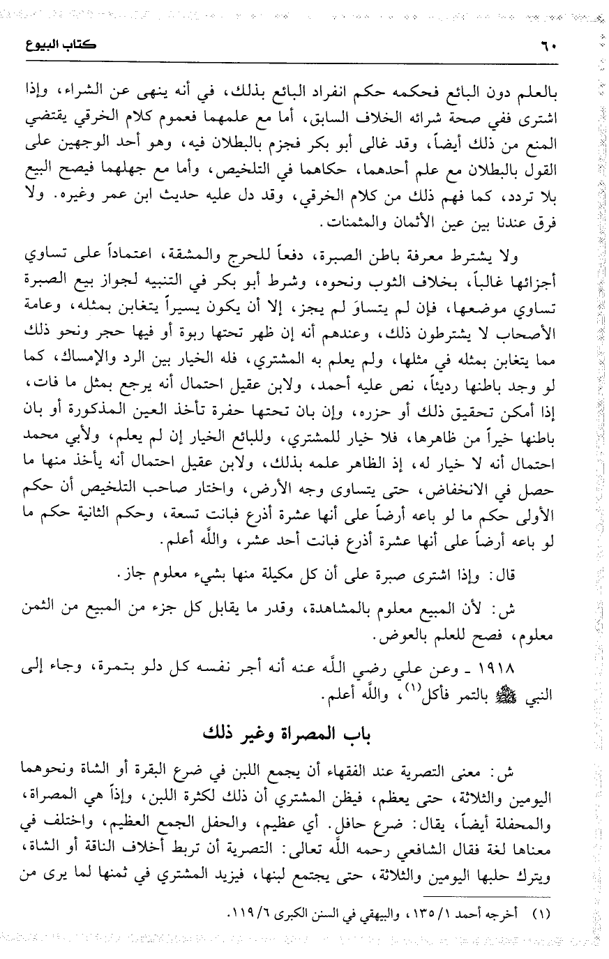 ولا يشترط معرفة باطن الصبرة ، دفعاً للحرج والمشقة ، اعتماداً على تساوي أجزائها غالباً ، بخلاف الثوب ونحوه ، وشرط أبو بكر في التنبيه لجواز بيع الصبرة تساوي موضعها ، فإن لم يتساوَ لم يجز ، إلا أن يكون يسيراً يتغابن بمثله ، وعامة الأصحاب لا يشترطون ذلك ، وعندهم أنه إن ظهر تحتها ربوة أو فيها حجر ونحو ذلك مما يتغابن بمثله في مثلها ، ولم يعلم به المشتري ، فله الخيار بين الرد والإمساك ، كما لو وجد باطنها رديئاً ، نص عليه أحمد ، ولابن عقيل احتمال أنه يرجع بمثل ما فات ، إذا أمكن تحقيق ذلك أو حزره ، وإن بان تحتها حفرة تأخذ العين المذكورة أو بان باطنها خيراً من ظاهرها ، فلا خيار للمشتري ، وللبائع الخيار إن لم يعلم ، ولأبي محمد احتمال أنه لا خيار له ، إذ الظاهر علمه بذلك ، ولابن عقيل احتمال أنه يأخذ منها ما حصل في الانخفاض ، حتى يتساوى وجه الأرض ، واختار صاحب التلخيص أن حكم الأولى حكم ما لو باعه أرضاً على أنها عشرة أذرع فبانت تسعة ، وحكم الثانية حكم ما لو باعه أرضاً على أنها عشرة أذرع فبانت أحد عشر ، واللَّه أعلم .