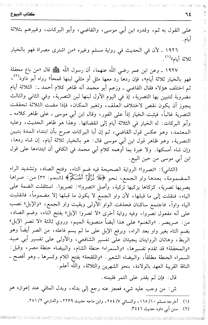 1926 لأن في الحديث في رواية مسلم وغيره ( من اشترى مصراة فهو بالخيار ثلاثة أيام ) .