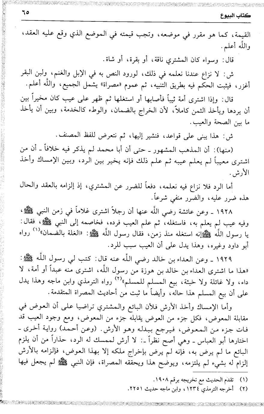 1929 وعن العداء بن خالد رضي اللَّه عنه قال : كتب لي رسول اللَّه : ( هذا ما اشترى العداء بن خالد بن هوزة من رسول اللَّه ، اشترى منه عبداً أو أمة ، لا داء ، ولا غائلة ولا خبثة ، بيع المسلم للمسلم ) رواه الترمذي وابن ماجه وهذا يدل على أن بيع المسلم هذا حاله ، وأيضاً ما ثبت من أحاديث المصراة المتقدمة .