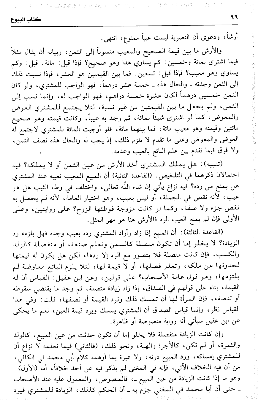 ( القاعدة الثالثة ) : أن المبيع إذا زاد وأراد المشتري رده بعيب وجده فهل يلزمه رد الزيادة ؟ لا يخلو إما أن تكون متصلة كالسمن وتعلم صنعة ، أو منفصلة كالولد والكسب ، فإن كانت متصلة فلا يتصور مع الرد إلا ردها ، لكن هل يكون له قيمتها لحدوثها عن ملكه ، وتعذر فصلها ، أو لا قيمة لها ، لئلا يلزم البائع معاوضة لم يلتزمها ، وهو قول عامة الأصحاب ؟ على قولين ، وعن ابن عقيل : القياس أن له القيمة ، بناء على قولهم في الصداق ، إذا زاد زيادة متصلة ، ثم وجد ما يقتضي سقوطه أو تنصفه ، فإن المرأة لها أن تمسك ذلك وترد القيمة أو نصفها ، قلت : وفي هذا القياس نظر ، وإنما قياس الصداق أن المشتري يمسك ويرد قيمة العين ، نعم ما يحكى عن ابن عقيل سيأتي أنه رواية منصوصة أو ظاهرة .