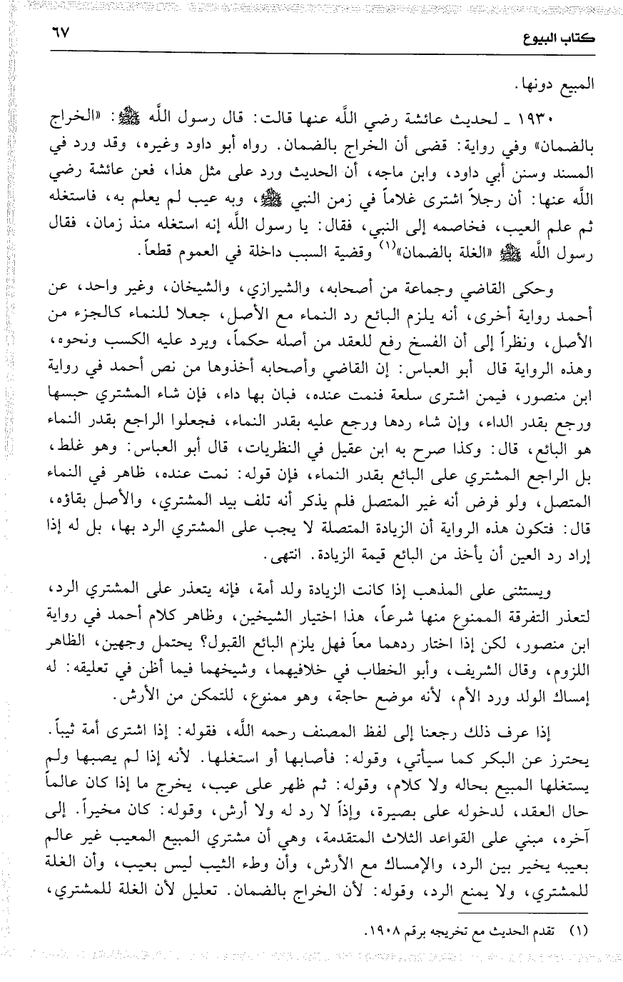 1930 لحديث عائشة رضي اللَّه عنها قالت : قال رسول اللَّه : ( الخراج بالضمان ) وفي رواية : قضى أن الخراج بالضمان . رواه أبو داود وغيره ، وقد ورد في المسند وسنن أبي داود ، وابن ماجه ، أن الحديث ورد على مثل هذا ، فعن عائشة رضي اللَّه عنها : أن رجلاً اشترى غلاماً في زمن النبي ، وبه عيب لم يعلم به ، فاستغله ثم علم العيب ، فخاصمه إلى النبي ، فقال : يا رسول اللَّه إنه استغله منذ زمان ، فقال رسول اللَّه ( الغلة بالضمان ) وقضية السبب داخلة في العموم قطعاً .